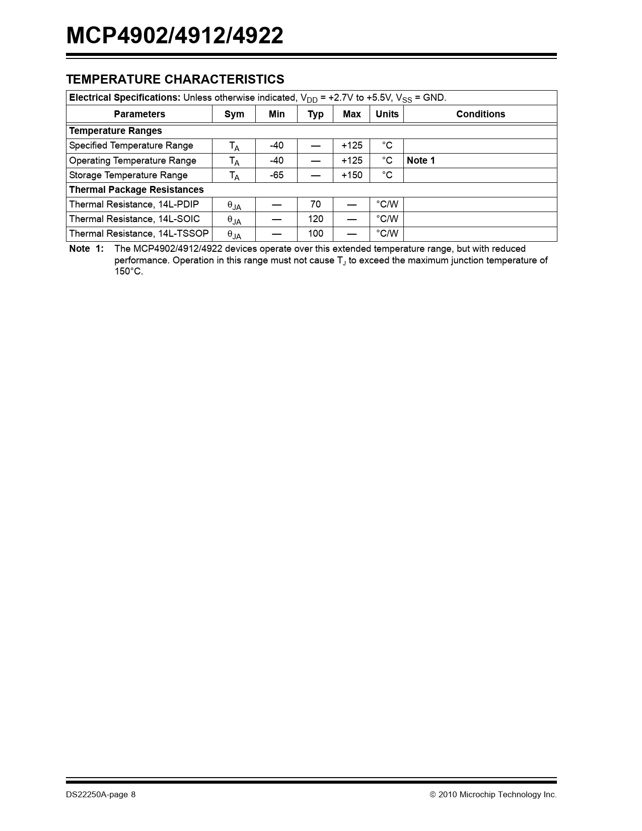link to page 8 MCP4902/4912/4922TEMPERATURE CHARACTERISTICSElectrical Specifications: Unless otherwise indicated, VDD = +2.7V to +5.5V, VSS = GND. ParametersSymMinTypMaxUnitsConditionsTemperature Ranges Specified Temperature Range TA -40 — +125 °C Operating Temperature Range TA -40 — +125 °C Note 1 Storage Temperature Range TA -65 — +150 °C Thermal Package Resistances Thermal Resistance, 14L-PDIP JA — 70 — °C/W Thermal Resistance, 14L-SOIC JA — 120 — °C/W Thermal Resistance, 14L-TSSOP JA — 100 — °C/W Note 1: The MCP4902/4912/4922 devices operate over this extended temperature range, but with reduced performance. Operation in this range must not cause T to exceed the maximum junction temperature of J 150°C. DS22250A-page 8 2010 Microchip Technology Inc. Document Outline 1.0 Electrical Characteristics FIGURE 1-1: SPI Input Timing Data. 2.0 Typical Performance Curves FIGURE 2-1: DNL vs. Code (MCP4922). FIGURE 2-2: DNL vs. Code and Temperature (MCP4922). FIGURE 2-3: DNL vs. Code and VREF, Gain = 1 (MCP4922). FIGURE 2-4: Absolute DNL vs. Temperature (MCP4922). FIGURE 2-5: Absolute DNL vs. Voltage Reference (MCP4922). FIGURE 2-6: INL vs. Code and Temperature (MCP4922). FIGURE 2-7: Absolute INL vs. Temperature (MCP4922). FIGURE 2-8: Absolute INL vs. VREF (MCP4922). FIGURE 2-9: INL vs. Code and VREF (MCP4922). FIGURE 2-10: INL vs. Code (MCP4922). FIGURE 2-11: DNL vs. Code and Temperature (MCP4912). FIGURE 2-12: INL vs. Code and Temperature (MCP4912). FIGURE 2-13: DNL vs. Code and Temperature (MCP4902). FIGURE 2-14: INL vs. Code and Temperature (MCP4902). FIGURE 2-15: IDD vs. Temperature and VDD. FIGURE 2-16: IDD Histogram (VDD = 2.7V). FIGURE 2-17: IDD Histogram (VDD = 5.0V). FIGURE 2-18: Hardware Shutdown Current vs. Ambient Temperature and VDD. FIGURE 2-19: Software Shutdown Current vs. Ambient Temperature and VDD. FIGURE 2-20: Offset Error vs. Ambient Temperature and VDD. FIGURE 2-21: Gain Error vs. Ambient Temperature and VDD. FIGURE 2-22: VIN High Threshold vs Ambient Temperature and VDD. FIGURE 2-23: VIN Low Threshold vs Ambient Temperature and VDD. FIGURE 2-24: Input Hysteresis vs. Ambient Temperature and VDD. FIGURE 2-25: VREF Input Impedance vs. Ambient Temperature and VDD. FIGURE 2-26: VOUT High Limit vs. Ambient Temperature and VDD. FIGURE 2-27: VOUT Low Limit vs. Ambient Temperature and VDD. FIGURE 2-28: IOUT High Short vs. Ambient Temperature and VDD. FIGURE 2-29: IOUT vs VOUT. Gain = 1x. FIGURE 2-30: VOUT Rise Time. FIGURE 2-31: VOUT Fall Time. FIGURE 2-32: VOUT Rise Time. FIGURE 2-33: VOUT Rise Time. FIGURE 2-34: VOUT Rise Time Exit Shutdown. FIGURE 2-35: PSRR vs. Frequency. FIGURE 2-36: Multiplier Mode Bandwidth. FIGURE 2-37: -3 db Bandwidth vs. Worst Codes. FIGURE 2-38: Phase Shift. 3.0 Pin Descriptions TABLE 3-1: Pin Function Table 3.1 Supply Voltage Pins (VDD, VSS) 3.2 Chip Select (CS) 3.3 Serial Clock Input (SCK) 3.4 Serial Data Input (SDI) 3.5 Latch DAC Input (LDAC) 3.6 Hardware Shutdown Input (SHDN) 3.7 Analog Outputs (VOUTA, VOUTB) 3.8 Voltage Reference Inputs (VREFA, VREFB) 4.0 General Overview TABLE 4-1: LSb of each device 4.1 DC Accuracy FIGURE 4-1: Example for INL Error. FIGURE 4-2: Example for DNL Accuracy. 4.2 Circuit Descriptions FIGURE 4-3: Typical Transient Response. FIGURE 4-4: Output Stage for Shutdown Mode. 5.0 Serial Interface 5.1 Overview 5.2 Write Command FIGURE 5-1: Write Command for MCP4922 (12-bit DAC). FIGURE 5-2: Write Command for MCP4912 (10-bit DAC). FIGURE 5-3: Write Command for MCP4902 (8-bit DAC). 6.0 Typical Applications 6.1 Digital Interface 6.2 Power Supply Considerations FIGURE 6-1: Typical Connection Diagram. 6.3 Layout Considerations 6.4 Single-Supply Operation 6.5 Bipolar Operation 6.6 Selectable Gain and Offset Bipolar Voltage Output Using a Dual DAC 6.7 Designing a Double-Precision DAC Using a Dual DAC 6.8 Building Programmable Current Source 6.9 Using Multiplier Mode 7.0 Development support 7.1 Evaluation and Demonstration Boards 8.0 Packaging Information 8.1 Package Marking Information Trademarks Worldwide Sales and Service