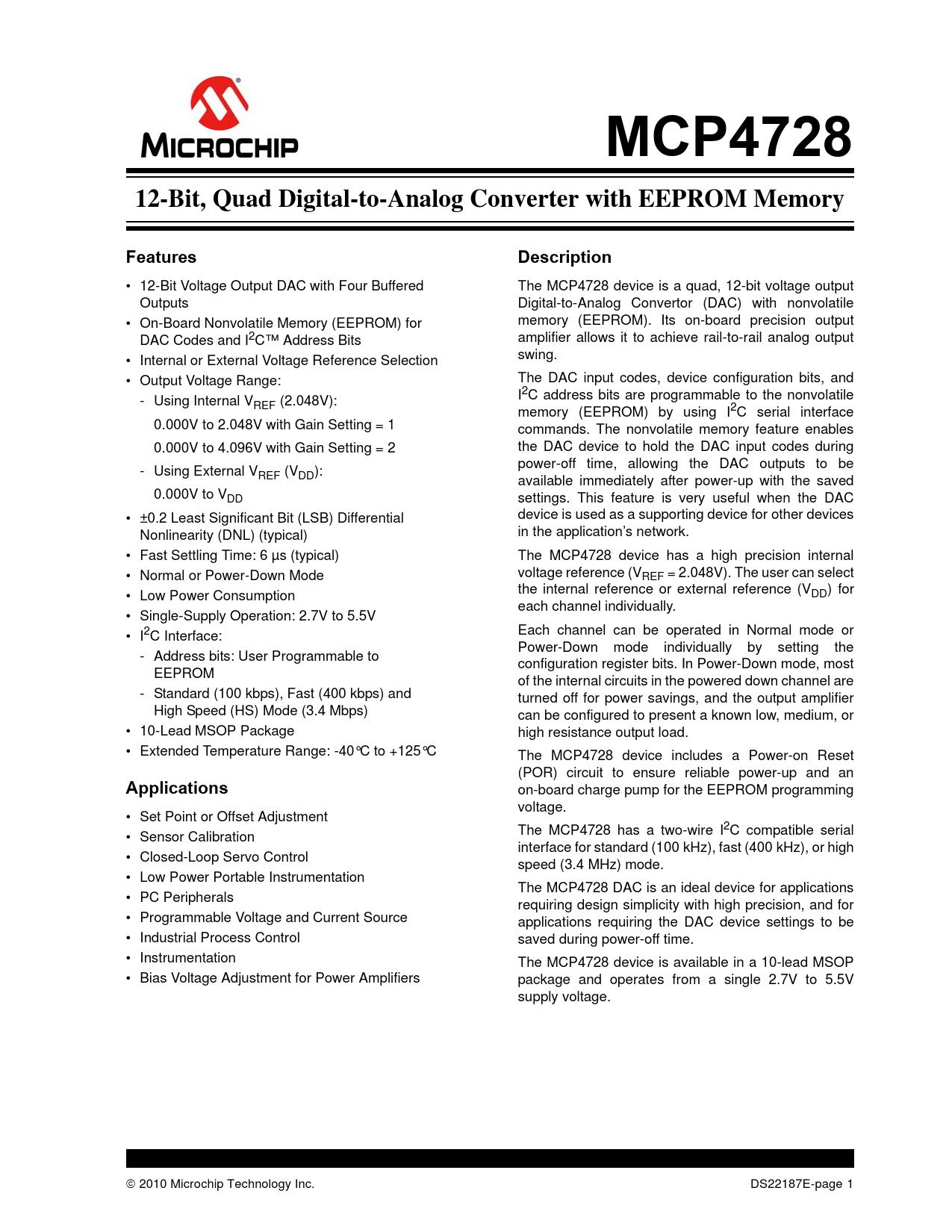 MCP4728. 12-Bit, Quad Digital-to-Analog Converter with EEPROM Memory. Features. Description. Applications