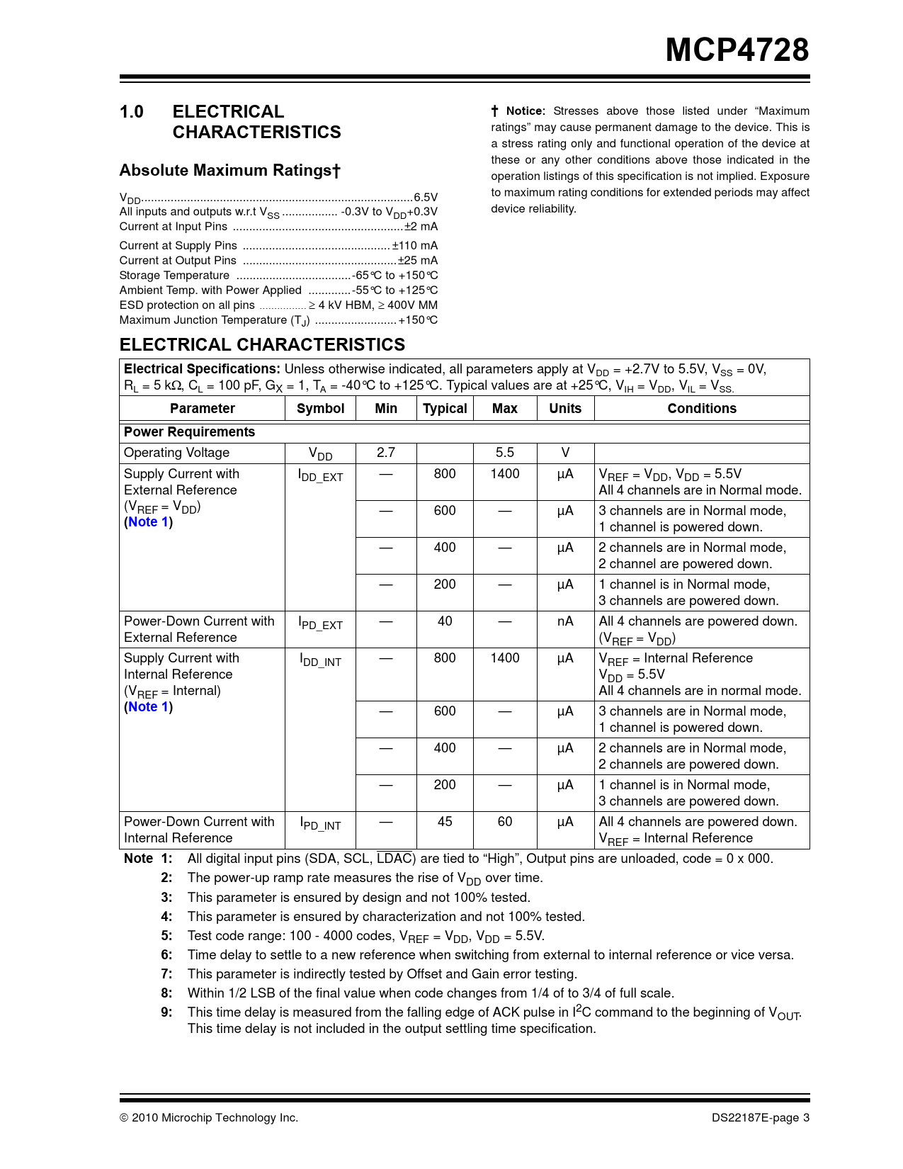 MCP4728. 1.0. ELECTRICAL. † Notice:. CHARACTERISTICS. Absolute Maximum Ratings†. ELECTRICAL CHARACTERISTICS
