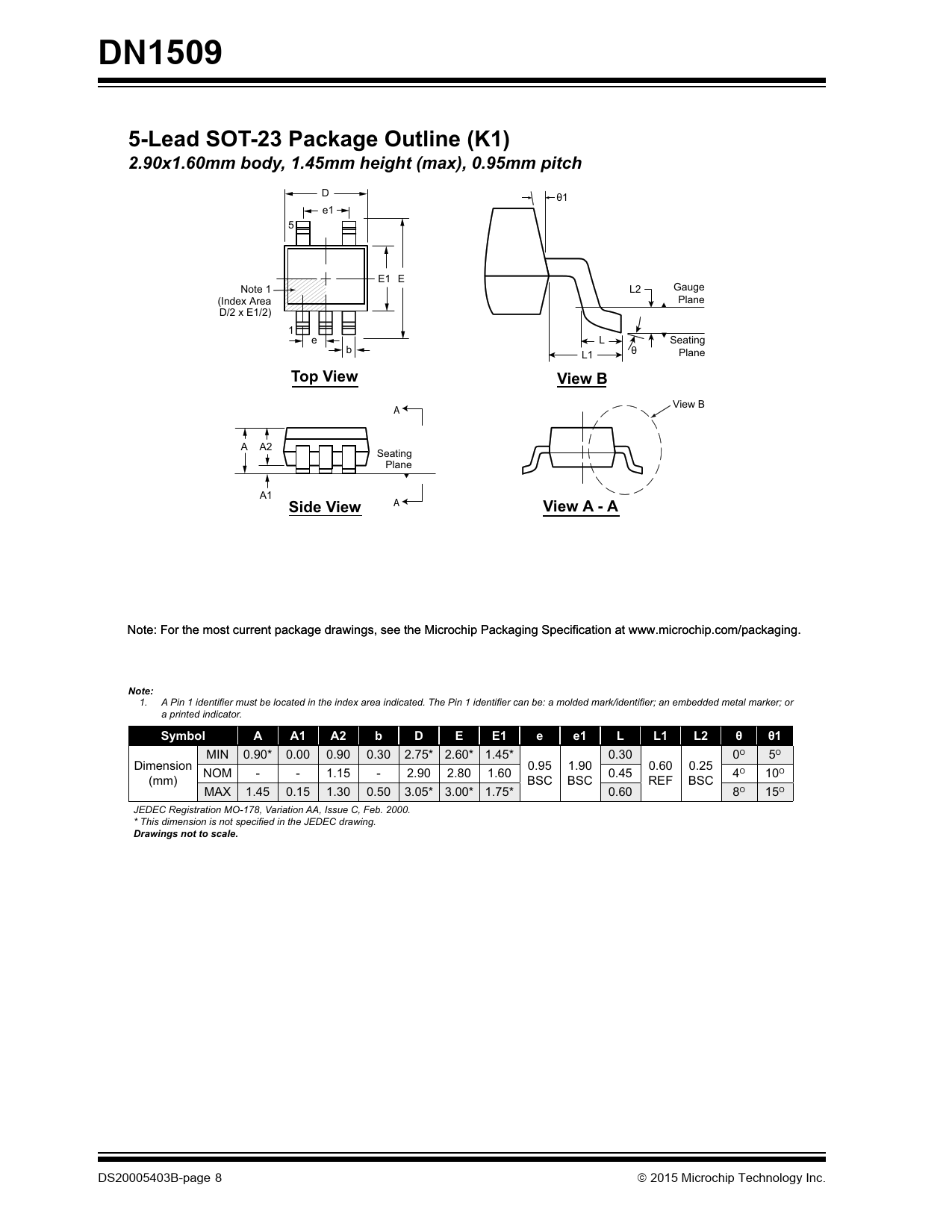 DN15095-Lead SOT-23 Package Outline (K1) 2.90x1.60mm body, 1.45mm height (max), 0.95mm pitch D θ1 e1 5 E1 E Gauge Note 1 L2 (Index Area Plane D/2 x E1/2) 1 e L Seating b θ Plane L1 Top ViewView B View B A A A2 Seating Plane A1 Side View A View A - A Note: For the most current package drawings, see the Microchip Packaging Specification at www.microchip.com/packaging. Note: 1. $3LQLGHQWL¿HUPXVWEHORFDWHGLQWKHLQGH[DUHDLQGLFDWHG7KH3LQLGHQWL¿HUFDQEHDPROGHGPDUNLGHQWL¿HUDQHPEHGGHGPHWDOPDUNHURU a printed indicator. SymbolAA1A2bDEE1ee1LL1L2șș MIN 0.90* 0.00 0.90 0.30 2.75* 2.60* 1.45* 0.30 0O 5O Dimension 0.95 1.90 0.60 0.25 NOM - - 1.15 - 2.90 2.80 1.60 0.45 4O 10O (mm) BSC BSC REF BSC MAX 1.45 0.15 1.30 0.50 3.05* 3.00* 1.75* 0.60 8O 15O JEDEC Registration MO-178, Variation AA, Issue C, Feb. 2000. 7KLVGLPHQVLRQLVQRWVSHFL¿HGLQWKH-('(&GUDZLQJ Drawings not to scale. DS20005403B-page 8 2015 Microchip Technology Inc. Document Outline 1.0 Electrical Characteristics 1.1 Electrical Specifications TABLE 1-1: DC and AC Characteristics TABLE 1-2: Typical Thermal Resistance TABLE 1-3: Thermal characteristics 2.0 Pin Description TABLE 2-1: Pin Description 3.0 Application Information FIGURE 3-1: Switching Waveforms and Test Circuit 4.0 Packaging Information 4.1 Package Marking Information AMERICAS Corporate Office Atlanta Austin, TX Boston Chicago Cleveland Dallas Detroit Houston, TX Indianapolis Los Angeles New York, NY San Jose, CA Canada - Toronto ASIA/PACIFIC Asia Pacific Office Hong Kong Australia - Sydney China - Beijing China - Chengdu China - Chongqing China - Dongguan China - Hangzhou China - Hong Kong SAR China - Nanjing China - Qingdao China - Shanghai China - Shenyang China - Shenzhen China - Wuhan China - Xian ASIA/PACIFIC China - Xiamen China - Zhuhai India - Bangalore India - New Delhi India - Pune Japan - Osaka Japan - Tokyo Korea - Daegu Korea - Seoul Malaysia - Kuala Lumpur Malaysia - Penang Philippines - Manila Singapore Taiwan - Hsin Chu Taiwan - Kaohsiung Taiwan - Taipei Thailand - Bangkok EUROPE Austria - Wels Denmark - Copenhagen France - Paris Germany - Dusseldorf Germany - Karlsruhe Germany - Munich Italy - Milan Italy - Venice Netherlands - Drunen Poland - Warsaw Spain - Madrid Sweden - Stockholm UK - Wokingham
