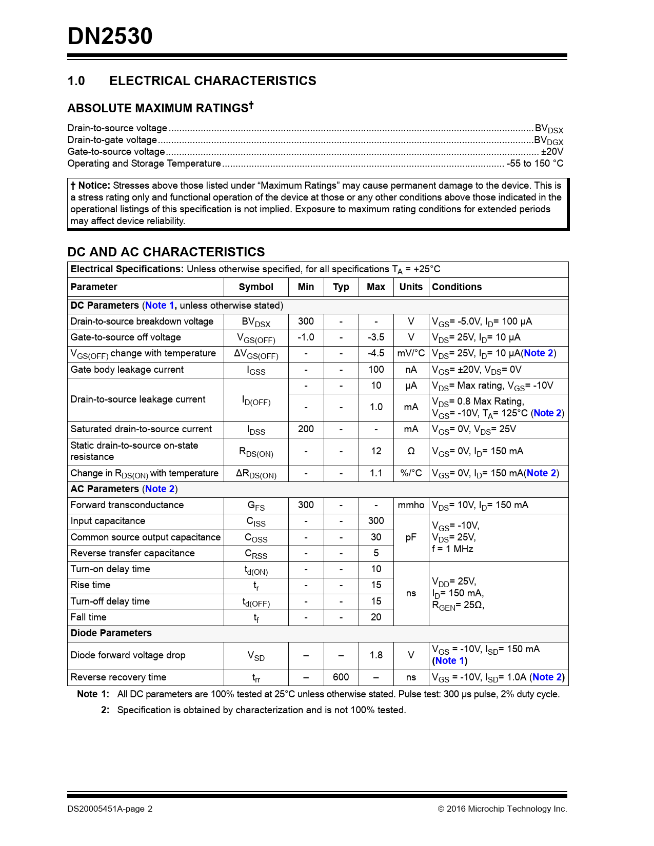 link to page 2 link to page 2 link to page 2 link to page 2 link to page 2 link to page 2 link to page 2 DN25301.0ELECTRICAL CHARACTERISTICSABSOLUTE MAXIMUM RATINGS† Drain-to-source voltage ...BVDSX Drain-to-gate voltage...BVDGX Gate-to-source voltage.. ±20V Operating and Storage Temperature.. -55 to 150 °C † Notice: Stresses above those listed under “Maximum Ratings” may cause permanent damage to the device. This is a stress rating only and functional operation of the device at those or any other conditions above those indicated in the operational listings of this specification is not implied. Exposure to maximum rating conditions for extended periods may affect device reliability. DC AND AC CHARACTERISTICSElectrical Specifications: Unless otherwise specified, for all specifications TA = +25°C ParameterSymbolMinTypMaxUnits ConditionsDC Parameters ( Note 1, unless otherwise stated) Drain-to-source breakdown voltage BVDSX 300 - - V VGS= -5.0V, ID= 100 µA Gate-to-source off voltage VGS(OFF) -1.0 - -3.5 V VDS= 25V, ID= 10 µA VGS(OFF) change with temperature ∆VGS(OFF) - - -4.5 mV/°C VDS= 25V, ID= 10 µA( Note 2 ) Gate body leakage current IGSS - - 100 nA VGS= ±20V, VDS= 0V - - 10 µA VDS= Max rating, VGS= -10V Drain-to-source leakage current ID(OFF) V - - 1.0 mA DS= 0.8 Max Rating, VGS= -10V, TA= 125°C ( Note 2 ) Saturated drain-to-source current IDSS 200 - - mA VGS= 0V, VDS= 25V Static drain-to-source on-state R resistance DS(ON) - - 12 Ω VGS= 0V, ID= 150 mA Change in RDS(ON) with temperature ∆RDS(ON) - - 1.1 %/°C VGS= 0V, ID= 150 mA( Note 2 ) AC Parameters ( Note 2 ) Forward transconductance GFS 300 - - mmho VDS= 10V, ID= 150 mA Input capacitance CISS - - 300 VGS= -10V, Common source output capacitance C pF V OSS - - 30 DS= 25V, f = 1 MHz Reverse transfer capacitance CRSS - - 5 Turn-on delay time td(ON) - - 10 V Rise time t DD= 25V, r - - 15 ns ID= 150 mA, Turn-off delay time td(OFF) - - 15 RGEN= 25Ω, Fall time tf - - 20 Diode Parameters V Diode forward voltage drop V GS = -10V, ISD= 150 mA SD – – 1.8 V (Note 1) Reverse recovery time trr – 600 – ns VGS = -10V, ISD= 1.0A ( Note 2)Note 1: All DC parameters are 100% tested at 25°C unless otherwise stated. Pulse test: 300 µs pulse, 2% duty cycle. 2: Specification is obtained by characterization and is not 100% tested. DS20005451A-page 2 2016 Microchip Technology Inc. Document Outline 1.0 Electrical Characteristics 2.0 Pin Description TABLE 2-1: Pin Description 3.0 Functional Description FIGURE 3-1: Switching Waveforms and Test Circuit FIGURE 3-2: Typical Performance Curves FIGURE 3-3: Typical Performance Curves (continued) 4.0 Packaging Information 4.1 Package Marking Information AMERICAS Corporate Office Atlanta Austin, TX Boston Chicago Cleveland Dallas Detroit Houston, TX Indianapolis Los Angeles New York, NY San Jose, CA Canada - Toronto ASIA/PACIFIC Asia Pacific Office Hong Kong Australia - Sydney China - Beijing China - Chengdu China - Chongqing China - Dongguan China - Hangzhou China - Hong Kong SAR China - Nanjing China - Qingdao China - Shanghai China - Shenyang China - Shenzhen China - Wuhan China - Xian ASIA/PACIFIC China - Xiamen China - Zhuhai India - Bangalore India - New Delhi India - Pune Japan - Osaka Japan - Tokyo Korea - Daegu Korea - Seoul Malaysia - Kuala Lumpur Malaysia - Penang Philippines - Manila Singapore Taiwan - Hsin Chu Taiwan - Kaohsiung Taiwan - Taipei Thailand - Bangkok EUROPE Austria - Wels Denmark - Copenhagen France - Paris Germany - Dusseldorf Germany - Karlsruhe Germany - Munich Italy - Milan Italy - Venice Netherlands - Drunen Poland - Warsaw Spain - Madrid Sweden - Stockholm UK - Wokingham
