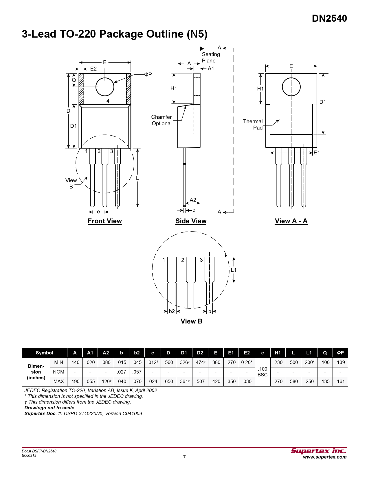 DN2540. 3-Lead TO-220 Package Outline (N5). Front View. Side View. View A - A. View B. Symbol. Dimen-. sion. (inches)
