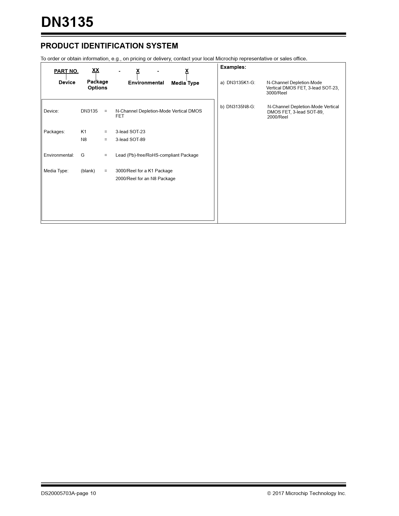 DN3135. PRODUCT IDENTIFICATION SYSTEM. Examples:. PART NO. XX. - X - X. Device Package Environmental Media Type. Options