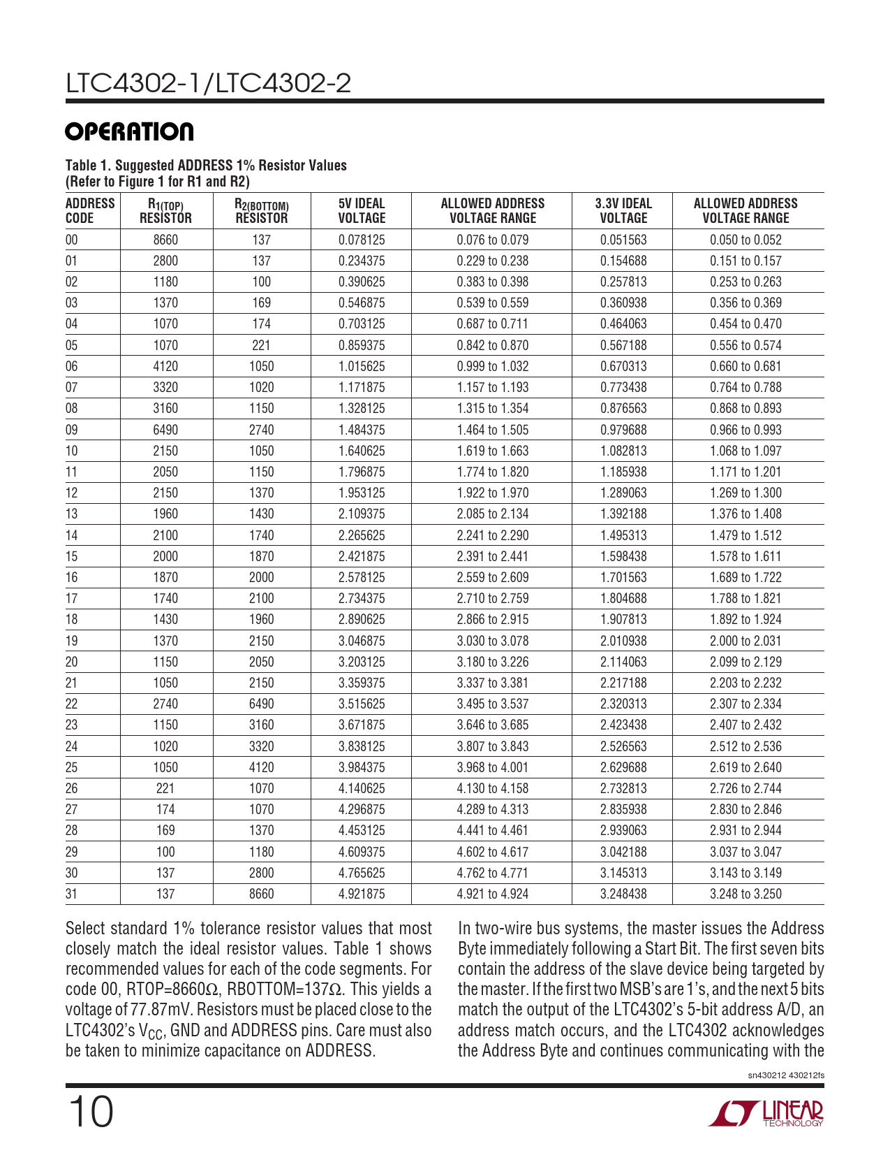 OPERATIO. Table 1. Suggested ADDRESS 1% Resistor Values (Refer to Figure 1 for R1 and R2). ADDRESS. R1(TOP). R2(BOTTOM). 5V IDEAL