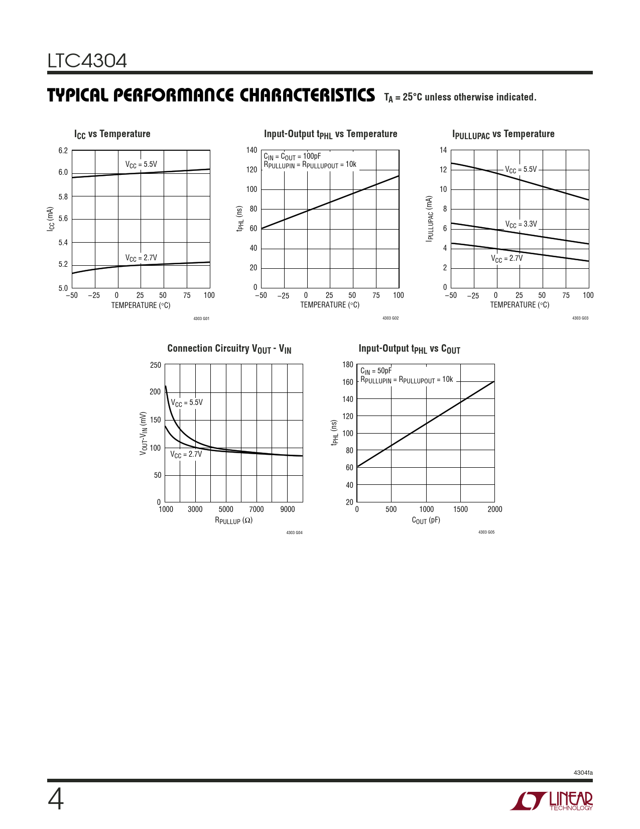 250 180 CIN = 50pF 160 RPULLUPIN = RPULLUPOUT = 10k 200 140 VCC = 5.5V 120 150 (mV) IN (ns) 100 -V t PHL OUT 100 V 80 VCC = 2.7V 60 50 40 0 20 1000 3000 5000 7000 9000 0 500 1000 1500 2000 RPULLUP (Ω) COUT (pF) 4303 G04 4303 G05 4304fa 4