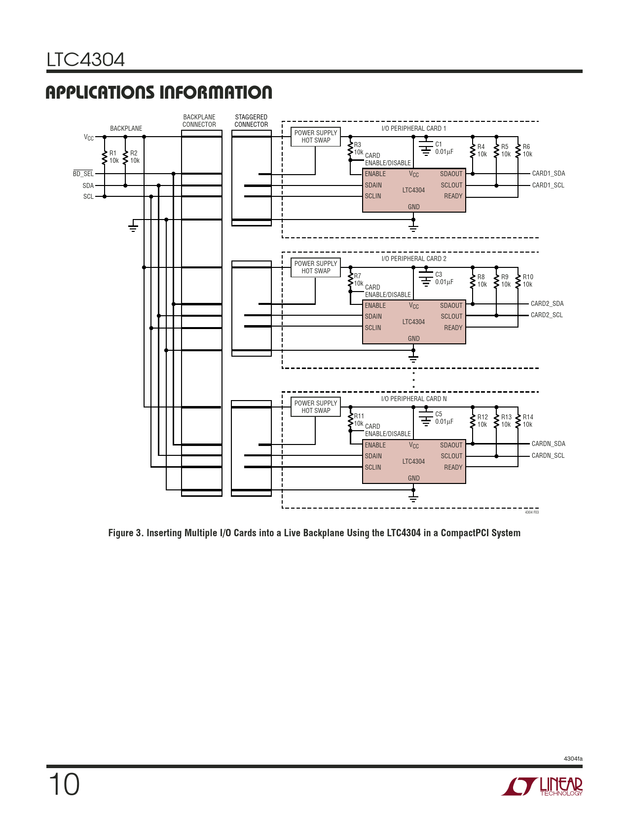 BACKPLANE STAGGERED CONNECTOR CONNECTOR BACKPLANE I/O PERIPHERAL CARD 1 POWER SUPPLY VCC HOT SWAP R3 C1 R4 R5 R6 R1 R2 10k 0.01µF 10k 10k 10k CARD 10k 10k ENABLE/DISABLE BD_SEL ENABLE V SDAOUT CARD1_SDA CC SDA SDAIN SCLOUT CARD1_SCL LTC4304 SCL SCLIN READY GND I/O PERIPHERAL CARD 2 POWER SUPPLY HOT SWAP R7 C3 R8 R9 R10 10k 0.01µF 10k 10k 10k CARD ENABLE/DISABLE CARD2_SDA ENABLE VCC SDAOUT CARD2_SCL SDAIN SCLOUT LTC4304 SCLIN READY GND • • • I/O PERIPHERAL CARD N POWER SUPPLY HOT SWAP R11 C5 R12 R13 R14 10k 0.01µF 10k 10k 10k CARD ENABLE/DISABLE CARDN_SDA ENABLE VCC SDAOUT SDAIN SCLOUT CARDN_SCL LTC4304 SCLIN READY GND 4304 F03