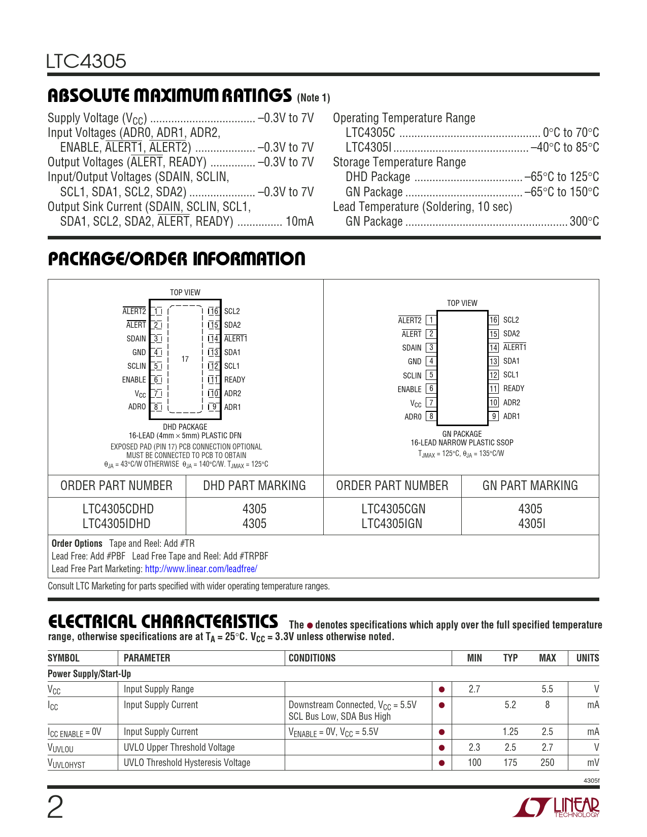 LTC4305 WWWUABSOLUTE AXI URATI GS (Note 1) Supply Voltage (VCC) ... –0.3V to 7V Operating Temperature Range Input Voltages (ADR0, ADR1, ADR2, LTC4305C ... 0°C to 70°C ENABLE, ALERT1, ALERT2) .. –0.3V to 7V LTC4305I ... –40°C to 85°C Output Voltages (ALERT, READY) ... –0.3V to 7V Storage Temperature Range Input/Output Voltages (SDAIN, SCLIN, DHD Package .. –65°C to 125°C SCL1, SDA1, SCL2, SDA2) .. –0.3V to 7V GN Package ... –65°C to 150°C Output Sink Current (SDAIN, SCLIN, SCL1, Lead Temperature (Soldering, 10 sec) SDA1, SCL2, SDA2, ALERT, READY) ... 10mA GN Package .. 300°C UWUPACKAGE/ORDER I FOR ATIO TOP VIEW TOP VIEW ALERT2 1 16 SCL2 ALERT2 1 16 SCL2 ALERT 2 15 SDA2 ALERT 2 15 SDA2 SDAIN 3 14 ALERT1 SDAIN 3 14 ALERT1 GND 4 13 SDA1 17 GND 4 13 SDA1 SCLIN 5 12 SCL1 SCLIN 5 12 SCL1 ENABLE 6 11 READY ENABLE 6 11 READY V 7 10 ADR2 CC V 7 10 CC ADR2 ADRO 8 9 ADR1 ADR0 8 9 ADR1 DHD PACKAGE GN PACKAGE 16-LEAD (4mm × 5mm) PLASTIC DFN 16-LEAD NARROW PLASTIC SSOP EXPOSED PAD (PIN 17) PCB CONNECTION OPTIONAL T MUST BE CONNECTED TO PCB TO OBTAIN JMAX = 125°C, θJA = 135°C/W θJA = 43°C/W OTHERWISE θJA = 140°C/W. TJMAX = 125°C ORDER PART NUMBER DHD PART MARKING ORDER PART NUMBER GN PART MARKING LTC4305CDHD 4305 LTC4305CGN 4305 LTC4305IDHD 4305 LTC4305IGN 4305I Order Options Tape and Reel: Add #TR Lead Free: Add #PBF Lead Free Tape and Reel: Add #TRPBF Lead Free Part Marketing: http://www.linear.com/leadfree/ Consult LTC Marketing for parts specified with wider operating temperature ranges. ELECTRICAL CHARACTERISTICS The ● denotes specifications which apply over the full specified temperature range, otherwise specifications are at TA = 25 ° C. VCC = 3.3V unless otherwise noted.SYMBOLPARAMETERCONDITIONSMINTYPMAXUNITSPower Supply/Start-Up VCC Input Supply Range ● 2.7 5.5 V ICC Input Supply Current Downstream Connected, VCC = 5.5V ● 5.2 8 mA SCL Bus Low, SDA Bus High ICC ENABLE = 0V Input Supply Current VENABLE = 0V, VCC = 5.5V ● 1.25 2.5 mA VUVLOU UVLO Upper Threshold Voltage ● 2.3 2.5 2.7 V VUVLOHYST UVLO Threshold Hysteresis Voltage ● 100 175 250 mV 4305f 2