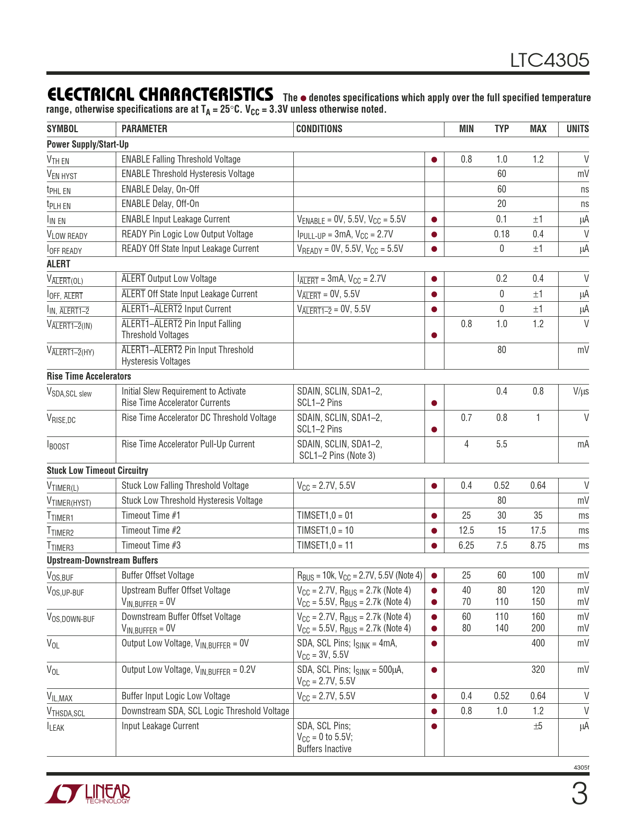 VOS,BUF Buffer Offset Voltage RBUS = 10k, VCC = 2.7V, 5.5V (Note 4) ● 25 60 100 mV VOS,UP-BUF Upstream Buffer Offset Voltage VCC = 2.7V, RBUS = 2.7k (Note 4) ● 40 80 120 mV VIN,BUFFER = 0V VCC = 5.5V, RBUS = 2.7k (Note 4) ● 70 110 150 mV VOS,DOWN-BUF Downstream Buffer Offset Voltage VCC = 2.7V, RBUS = 2.7k (Note 4) ● 60 110 160 mV VIN,BUFFER = 0V VCC = 5.5V, RBUS = 2.7k (Note 4) ● 80 140 200 mV VOL Output Low Voltage, VIN,BUFFER = 0V SDA, SCL Pins; ISINK = 4mA, ● 400 mV VCC = 3V, 5.5V VOL Output Low Voltage, VIN,BUFFER = 0.2V SDA, SCL Pins; ISINK = 500µA, ● 320 mV VCC = 2.7V, 5.5V VIL,MAX Buffer Input Logic Low Voltage VCC = 2.7V, 5.5V ● 0.4 0.52 0.64 V VTHSDA,SCL Downstream SDA, SCL Logic Threshold Voltage ● 0.8 1.0 1.2 V ILEAK Input Leakage Current SDA, SCL Pins; ● ±5 µA VCC = 0 to 5.5V; Buffers Inactive 4305f 3