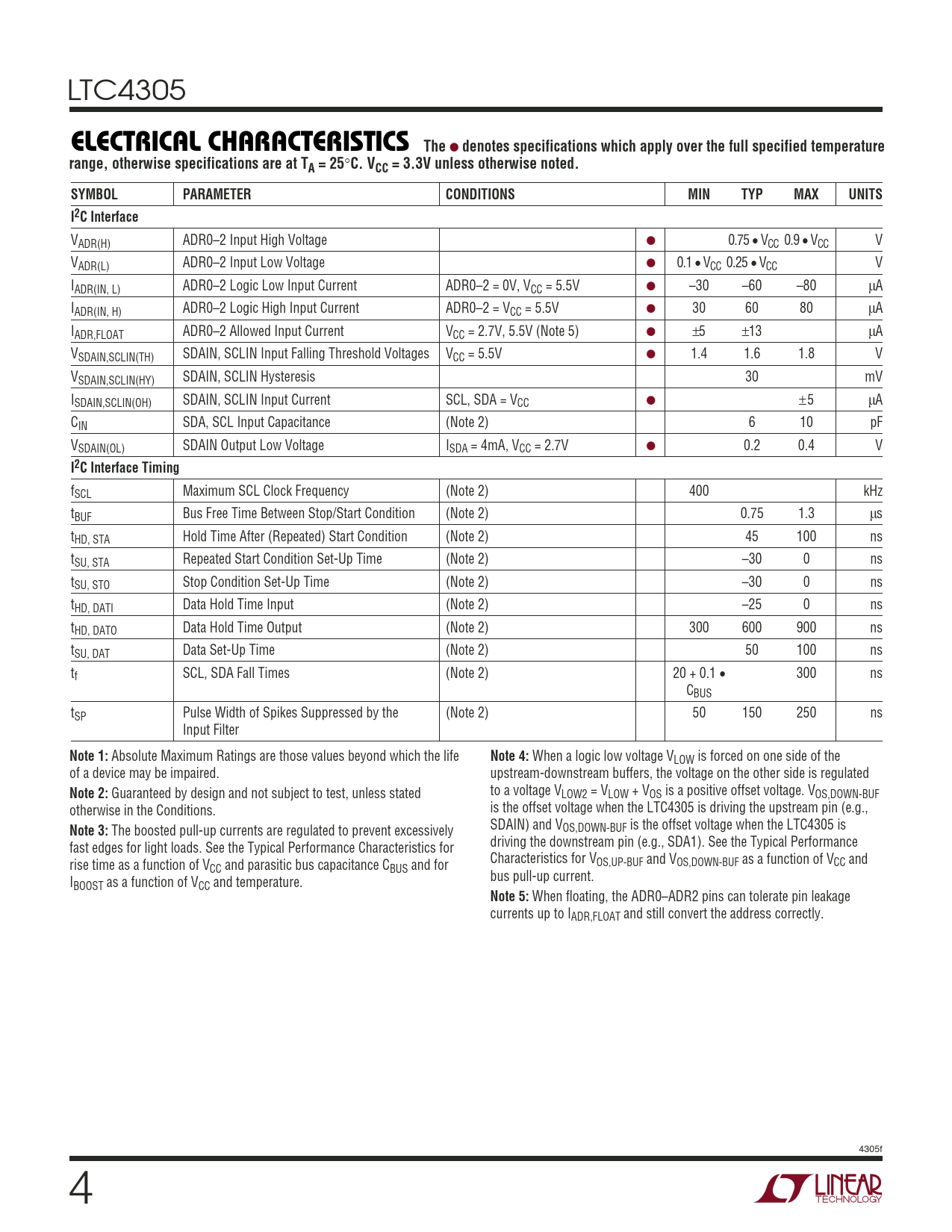 LTC4305 ELECTRICAL CHARACTERISTICS The ● denotes specifications which apply over the full specified temperaturerange, otherwise specifications are at TA = 25 ° C. VCC = 3.3V unless otherwise noted.SYMBOLPARAMETERCONDITIONSMINTYPMAXUNITSI2C Interface VADR(H) ADR0–2 Input High Voltage ● 0.75 • VCC 0.9 • VCC V VADR(L) ADR0–2 Input Low Voltage ● 0.1 • VCC 0.25 • VCC V IADR(IN, L) ADR0–2 Logic Low Input Current ADR0–2 = 0V, VCC = 5.5V ● –30 –60 –80 µA IADR(IN, H) ADR0–2 Logic High Input Current ADR0–2 = VCC = 5.5V ● 30 60 80 µA IADR,FLOAT ADR0–2 Allowed Input Current VCC = 2.7V, 5.5V (Note 5) ● ±5 ±13 µA VSDAIN,SCLIN(TH) SDAIN, SCLIN Input Falling Threshold Voltages VCC = 5.5V ● 1.4 1.6 1.8 V VSDAIN,SCLIN(HY) SDAIN, SCLIN Hysteresis 30 mV ISDAIN,SCLIN(OH) SDAIN, SCLIN Input Current SCL, SDA = VCC ● ±5 µA CIN SDA, SCL Input Capacitance (Note 2) 6 10 pF VSDAIN(OL) SDAIN Output Low Voltage ISDA = 4mA, VCC = 2.7V ● 0.2 0.4 V I2C Interface Timing fSCL Maximum SCL Clock Frequency (Note 2) 400 kHz tBUF Bus Free Time Between Stop/Start Condition (Note 2) 0.75 1.3 µs tHD, STA Hold Time After (Repeated) Start Condition (Note 2) 45 100 ns tSU, STA Repeated Start Condition Set-Up Time (Note 2) –30 0 ns tSU, STO Stop Condition Set-Up Time (Note 2) –30 0 ns tHD, DATI Data Hold Time Input (Note 2) –25 0 ns tHD, DATO Data Hold Time Output (Note 2) 300 600 900 ns tSU, DAT Data Set-Up Time (Note 2) 50 100 ns tf SCL, SDA Fall Times (Note 2) 20 + 0.1 • 300 ns CBUS tSP Pulse Width of Spikes Suppressed by the (Note 2) 50 150 250 ns Input Filter Note 1: Absolute Maximum Ratings are those values beyond which the life Note 4: When a logic low voltage VLOW is forced on one side of the of a device may be impaired. upstream-downstream buffers, the voltage on the other side is regulated Note 2: Guaranteed by design and not subject to test, unless stated to a voltage VLOW2 = VLOW + VOS is a positive offset voltage. VOS,DOWN-BUF otherwise in the Conditions. is the offset voltage when the LTC4305 is driving the upstream pin (e.g., Note 3: The boosted pull-up currents are regulated to prevent excessively SDAIN) and VOS,DOWN-BUF is the offset voltage when the LTC4305 is fast edges for light loads. See the Typical Performance Characteristics for driving the downstream pin (e.g., SDA1). See the Typical Performance rise time as a function of V Characteristics for VOS,UP-BUF and VOS,DOWN-BUF as a function of VCC and CC and parasitic bus capacitance CBUS and for I bus pull-up current. BOOST as a function of VCC and temperature. Note 5: When floating, the ADR0–ADR2 pins can tolerate pin leakage currents up to IADR,FLOAT and still convert the address correctly. 4305f 4
