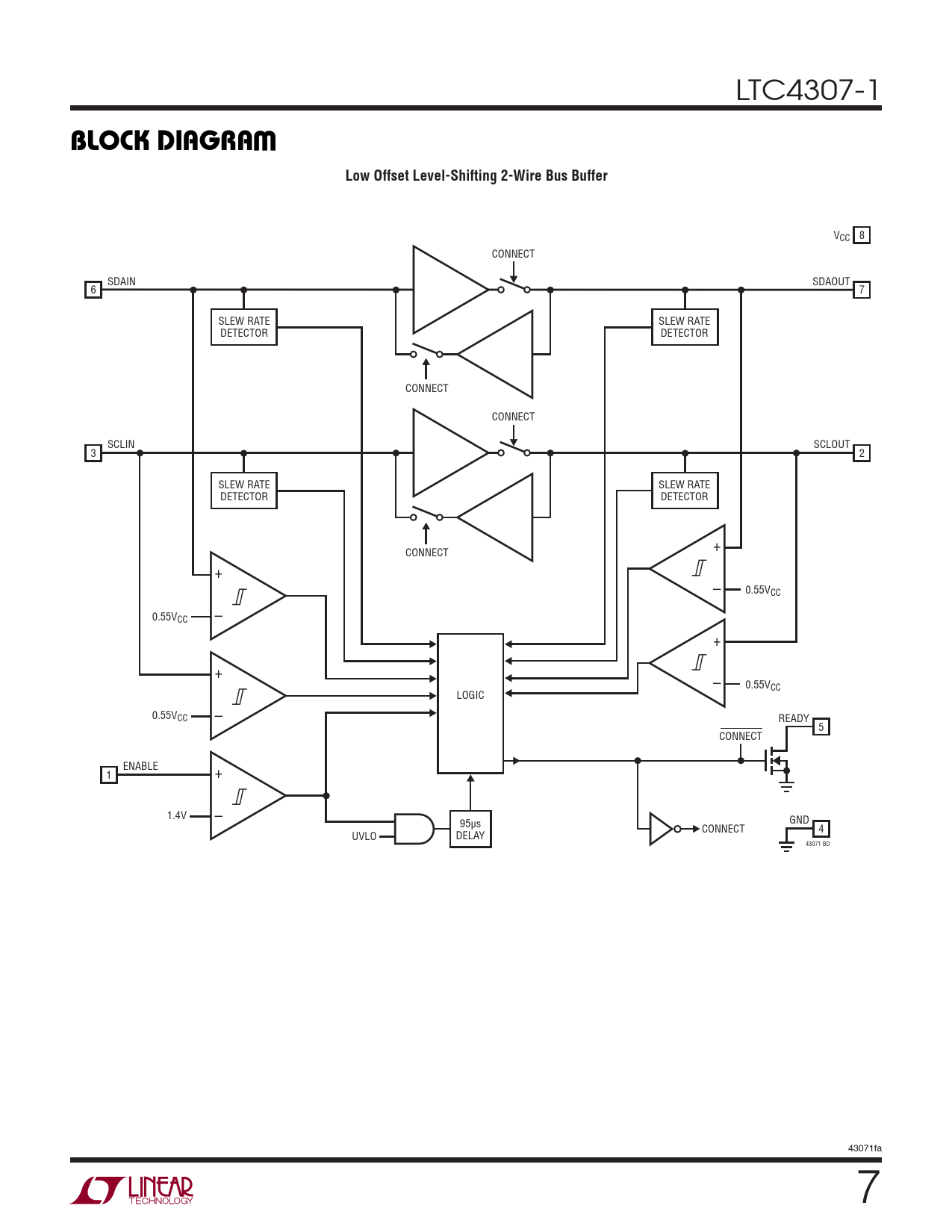 VCC 8 CONNECT SDAIN SDAOUT 6 7 SLEW RATE SLEW RATE DETECTOR DETECTOR CONNECT CONNECT SCLIN SCLOUT 3 2 SLEW RATE SLEW RATE DETECTOR DETECTOR + CONNECT + – 0.55VCC 0.55VCC – + + – 0.55VCC LOGIC 0.55VCC – READY 5 CONNECT ENABLE 1 + 1.4V – GND 95μs CONNECT 4 UVLO DELAY 43071 BD 43071fa 7