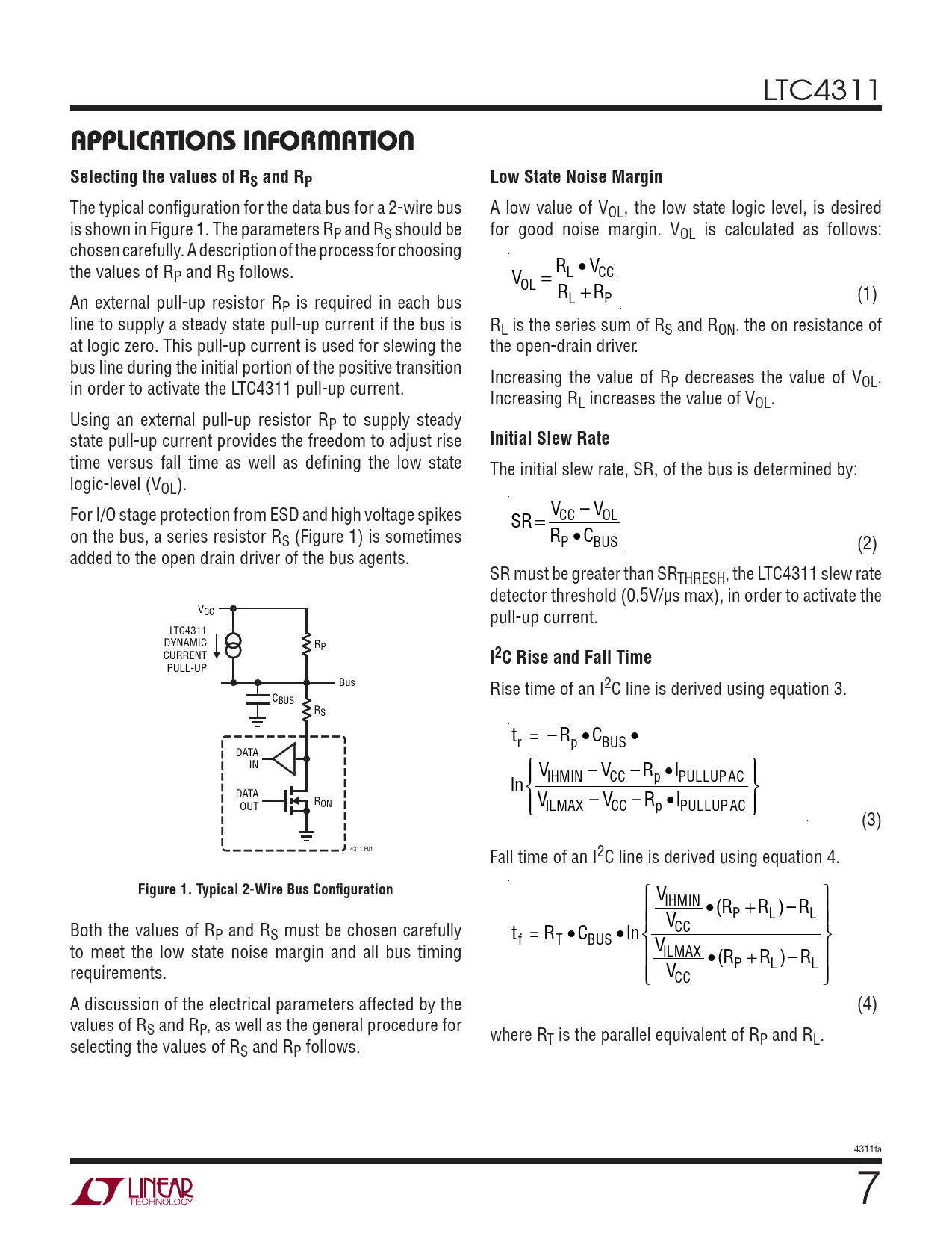 PULL-UP Bus Rise time of an I2C line is derived using equation 3. CBUS RS t = – R •C • r p BUS DATA IN ⎧ V – V – R ⎪ •I ⎫⎪ ln IHMIN CC p PULLUP AC DATA ⎨ ⎬ R V – V – R •I ON OUT ILMAX CC p PULLUP AC ⎩⎪ ⎭⎪ (3) 4311 F01 Fall time of an I2C line is derived using equation 4.