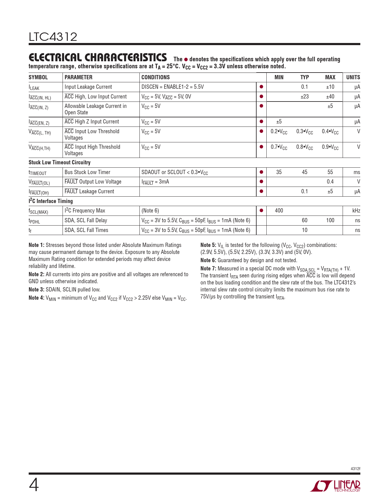 LTC4312 ELECTRICAL CHARACTERISTICSThe l denotes the specifi cations which apply over the full operatingtemperature range, otherwise specifi cations are at TA = 25°C. VCC = VCC2 = 3.3V unless otherwise noted.SYMBOLPARAMETERCONDITIONSMINTYPMAXUNITS ILEAK Input Leakage Current DISCEN = ENABLE1-2 = 5.5V l 0.1 ±10 μA IACC(IN, HL) ACC High, Low Input Current VCC = 5V, VACC = 5V, 0V l ±23 ±40 μA IACC(IN, Z) Allowable Leakage Current in VCC = 5V l ±5 μA Open State IACC(EN, Z) ACC High Z Input Current VCC = 5V l ±5 μA VACC(L, TH) ACC Input Low Threshold VCC = 5V l 0.2•VCC 0.3•VCC 0.4•VCC V Voltages VACC(H,TH) ACC Input High Threshold VCC = 5V l 0.7•VCC 0.8•VCC 0.9•VCC V Voltages Stuck Low Timeout Circuitry tTIMEOUT Bus Stuck Low Timer SDAOUT or SCLOUT < 0.3•VCC l 35 45 55 ms VFAULT(OL) FAULT Output Low Voltage IFAULT = 3mA l 0.4 V IFAULT(OH) FAULT Leakage Current l 0.1 ±5 μA I2C Interface Timing fSCL(MAX) I2C Frequency Max (Note 6) l 400 kHz tPDHL SDA, SCL Fall Delay VCC = 3V to 5.5V, CBUS = 50pF, IBUS = 1mA (Note 6) 60 100 ns tf SDA, SCL Fall Times VCC = 3V to 5.5V, CBUS = 50pF, IBUS = 1mA (Note 6) 10 ns Note 1: Stresses beyond those listed under Absolute Maximum Ratings Note 5: VIL is tested for the following (VCC, VCC2) combinations: may cause permanent damage to the device. Exposure to any Absolute (2.9V, 5.5V), (5.5V, 2.25V), (3.3V, 3.3V) and (5V, 0V). Maximum Rating condition for extended periods may affect device Note 6: Guaranteed by design and not tested. reliability and lifetime. Note 7: Measured in a special DC mode with VSDA,SCL = VRTA(TH) + 1V. Note 2: All currents into pins are positive and all voltages are referenced to The transient IRTA seen during rising edges when ACC is low will depend GND unless otherwise indicated. on the bus loading condition and the slew rate of the bus. The LTC4312’s Note 3: SDAIN, SCLIN pulled low. internal slew rate control circuitry limits the maximum bus rise rate to Note 4: V 75V/μs by controlling the transient I MIN = minimum of VCC and VCC2 if VCC2 > 2.25V else VMIN = VCC. RTA. 4312f 4