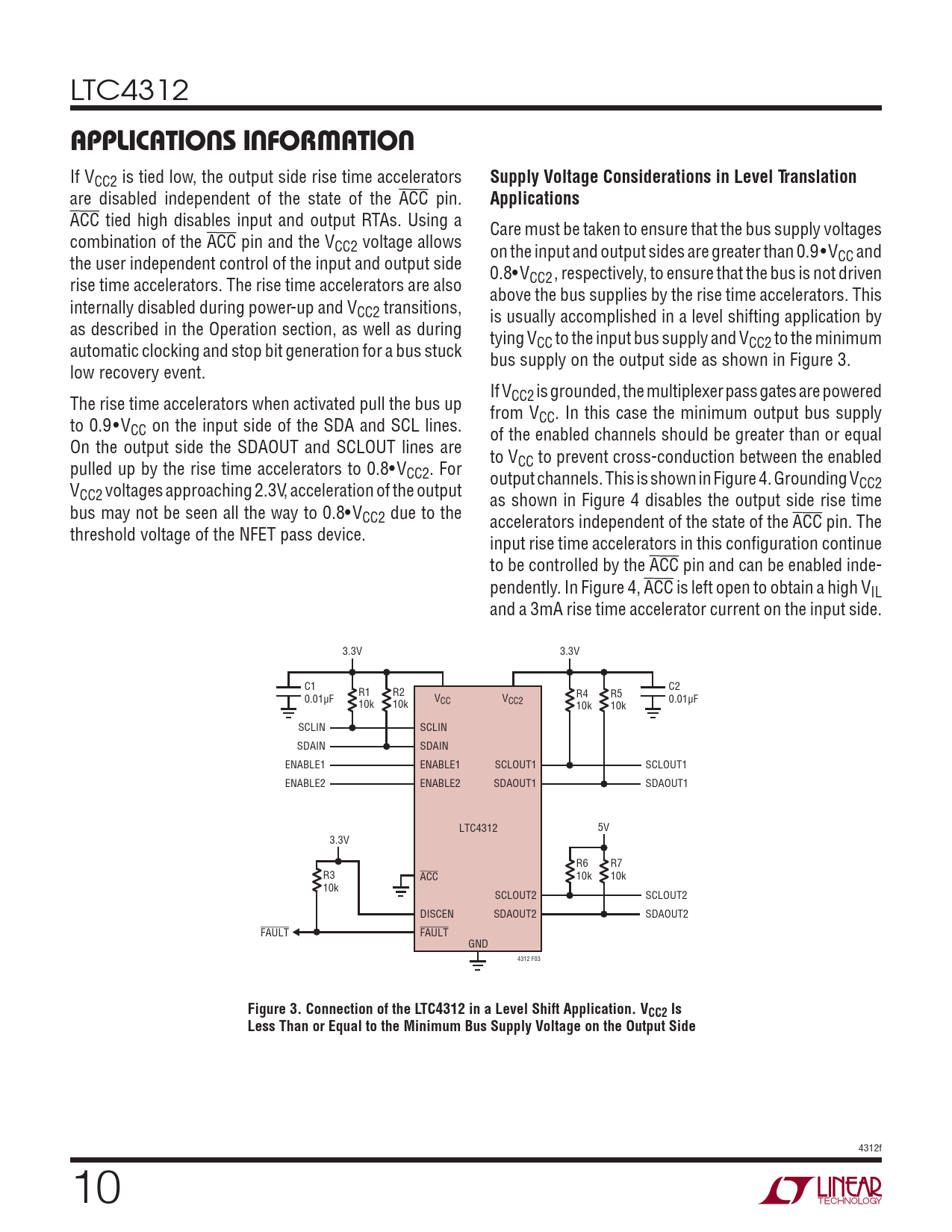 ACC tied high disables input and output RTAs. Using a Care must be taken to ensure that the bus supply voltages combination of the ACC pin and the VCC2 voltage allows on the input and output sides are greater than 0.9•V the user independent control of the input and output side CC and 0.8•V rise time accelerators. The rise time accelerators are also CC2, respectively, to ensure that the bus is not driven above the bus supplies by the rise time accelerators. This internally disabled during power-up and VCC2 transitions, is usually accomplished in a level shifting application by as described in the Operation section, as well as during tying V automatic clocking and stop bit generation for a bus stuck CC to the input bus supply and VCC2 to the minimum bus supply on the output side as shown in Figure 3. low recovery event. If V The rise time accelerators when activated pull the bus up CC2 is grounded, the multiplexer pass gates are powered from V to 0.9•V CC. In this case the minimum output bus supply CC on the input side of the SDA and SCL lines. of the enabled channels should be greater than or equal On the output side the SDAOUT and SCLOUT lines are to V pulled up by the rise time accelerators to 0.8•V CC to prevent cross-conduction between the enabled CC2. For output channels. This is shown in Figure 4. Grounding V V CC2 CC2 voltages approaching 2.3V, acceleration of the output as shown in Figure 4 disables the output side rise time bus may not be seen all the way to 0.8•VCC2 due to the accelerators independent of the state of the ACC pin. The threshold voltage of the NFET pass device. input rise time accelerators in this confi guration continue to be controlled by the ACC pin and can be enabled inde- pendently. In Figure 4, ACC is left open to obtain a high VIL and a 3mA rise time accelerator current on the input side. 3.3V 3.3V C1 C2 R1 R2 0.01μF V R4 R5 CC VCC2 0.01μF 10k 10k 10k 10k SCLIN SCLIN SDAIN SDAIN ENABLE1 ENABLE1 SCLOUT1 SCLOUT1 ENABLE2 ENABLE2 SDAOUT1 SDAOUT1 LTC4312 5V 3.3V R6 R7 R3 ACC 10k 10k 10k SCLOUT2 SCLOUT2 DISCEN SDAOUT2 SDAOUT2 FAULT FAULT GND 4312 F03