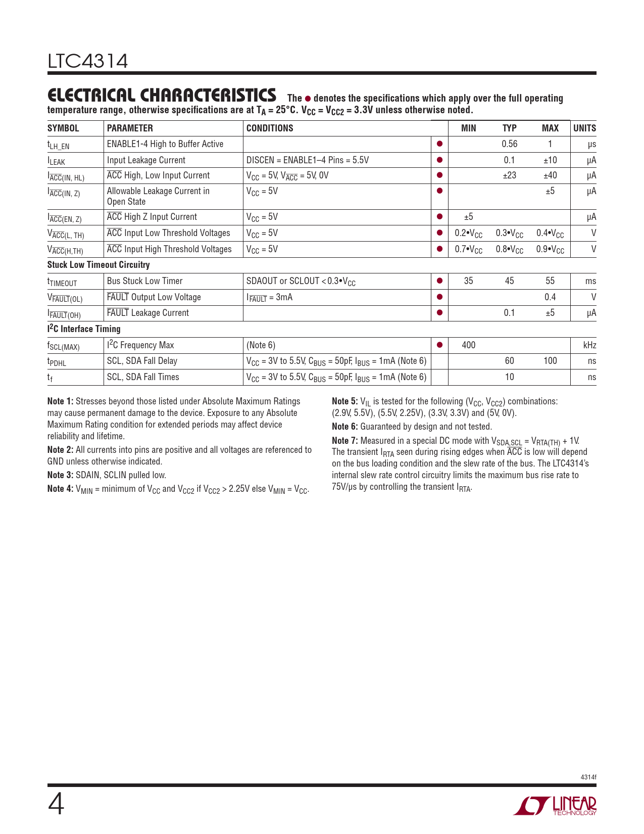 LTC4314 ELECTRICAL CHARACTERISTICSThe l denotes the specifi cations which apply over the full operatingtemperature range, otherwise specifi cations are at TA = 25°C. VCC = VCC2 = 3.3V unless otherwise noted.SYMBOLPARAMETERCONDITIONSMINTYPMAXUNITS tLH_EN ENABLE1-4 High to Buffer Active l 0.56 1 μs ILEAK Input Leakage Current DISCEN = ENABLE1–4 Pins = 5.5V l 0.1 ±10 μA IACC(IN, HL) ACC High, Low Input Current VCC = 5V, VACC = 5V, 0V l ±23 ±40 μA IACC(IN, Z) Allowable Leakage Current in VCC = 5V l ±5 μA Open State IACC(EN, Z) ACC High Z Input Current VCC = 5V l ±5 μA VACC(L, TH) ACC Input Low Threshold Voltages VCC = 5V l 0.2•VCC 0.3•VCC 0.4•VCC V VACC(H,TH) ACC Input High Threshold Voltages VCC = 5V l 0.7•VCC 0.8•VCC 0.9•VCC V Stuck Low Timeout Circuitry tTIMEOUT Bus Stuck Low Timer SDAOUT or SCLOUT < 0.3•VCC l 35 45 55 ms VFAULT(OL) FAULT Output Low Voltage IFAULT = 3mA l 0.4 V IFAULT(OH) FAULT Leakage Current l 0.1 ±5 μA I2C Interface Timing fSCL(MAX) I2C Frequency Max (Note 6) l 400 kHz tPDHL SCL, SDA Fall Delay VCC = 3V to 5.5V, CBUS = 50pF, IBUS = 1mA (Note 6) 60 100 ns tf SCL, SDA Fall Times VCC = 3V to 5.5V, CBUS = 50pF, IBUS = 1mA (Note 6) 10 ns Note 1: Stresses beyond those listed under Absolute Maximum Ratings Note 5: VIL is tested for the following (VCC, VCC2) combinations: may cause permanent damage to the device. Exposure to any Absolute (2.9V, 5.5V), (5.5V, 2.25V), (3.3V, 3.3V) and (5V, 0V). Maximum Rating condition for extended periods may affect device Note 6: Guaranteed by design and not tested. reliability and lifetime. Note 7: Measured in a special DC mode with VSDA,SCL = VRTA(TH) + 1V. Note 2: All currents into pins are positive and all voltages are referenced to The transient IRTA seen during rising edges when ACC is low will depend GND unless otherwise indicated. on the bus loading condition and the slew rate of the bus. The LTC4314’s Note 3: SDAIN, SCLIN pulled low. internal slew rate control circuitry limits the maximum bus rise rate to Note 4: V 75V/μs by controlling the transient I MIN = minimum of VCC and VCC2 if VCC2 > 2.25V else VMIN = VCC. RTA. 4314f 4