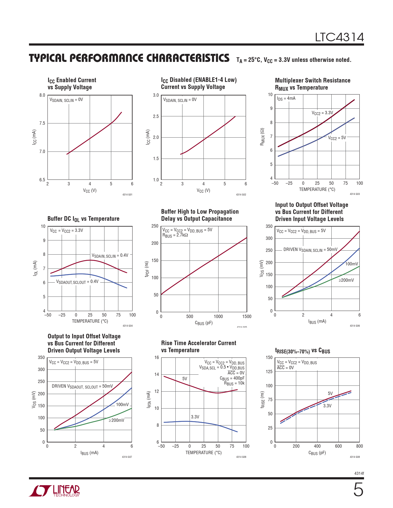 8.0 3.0 10 V I SDAIN, SCLIN = 0V VSDAIN, SCLIN = 0V DS = 4mA 9 VCC2 = 3.3V 2.5 7.5 8 (Ω) (mA) (mA) 2.0 7 VCC2 = 5V MUX I CC I CC R 7.0 6 1.5 5 6.5 1.0 4 2 3 4 5 6 2 3 4 5 6 –50 –25 0 25 50 75 100 VCC (V) VCC (V) TEMPERATURE (°C) 4314 G01 4314 G02 4314 G03