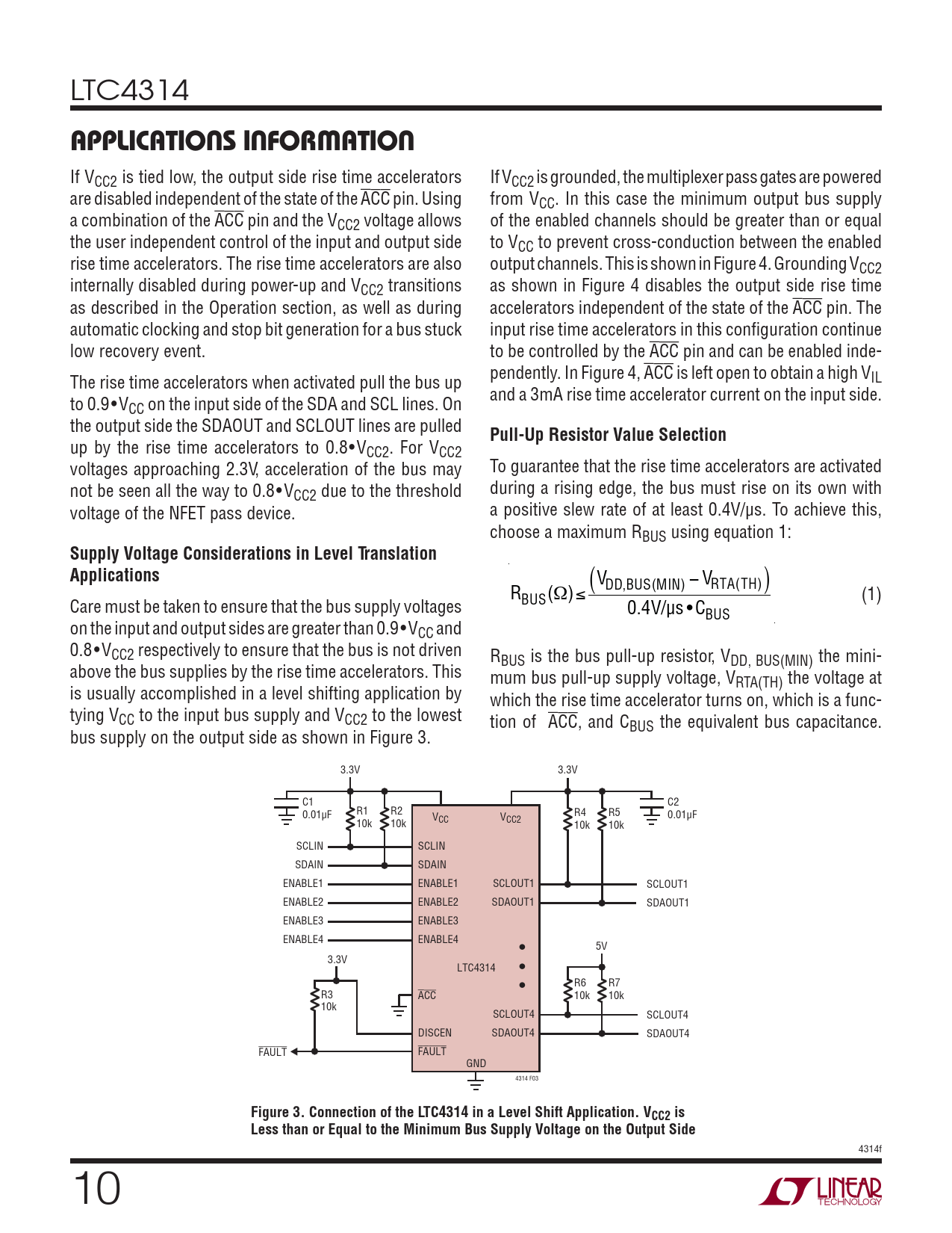 If VCC2 is tied low, the output side rise time accelerators If VCC2 is grounded, the multiplexer pass gates are powered are disabled independent of the state of the ACC pin. Using from VCC. In this case the minimum output bus supply a combination of the ACC pin and the VCC2 voltage allows of the enabled channels should be greater than or equal the user independent control of the input and output side to VCC to prevent cross-conduction between the enabled rise time accelerators. The rise time accelerators are also output channels. This is shown in Figure 4. Grounding VCC2 internally disabled during power-up and VCC2 transitions as shown in Figure 4 disables the output side rise time as described in the Operation section, as well as during accelerators independent of the state of the ACC pin. The automatic clocking and stop bit generation for a bus stuck input rise time accelerators in this confi guration continue low recovery event. to be controlled by the ACC pin and can be enabled inde- pendently. In Figure 4, ACC is left open to obtain a high V The rise time accelerators when activated pull the bus up IL and a 3mA rise time accelerator current on the input side. to 0.9•VCC on the input side of the SDA and SCL lines. On the output side the SDAOUT and SCLOUT lines are pulled
