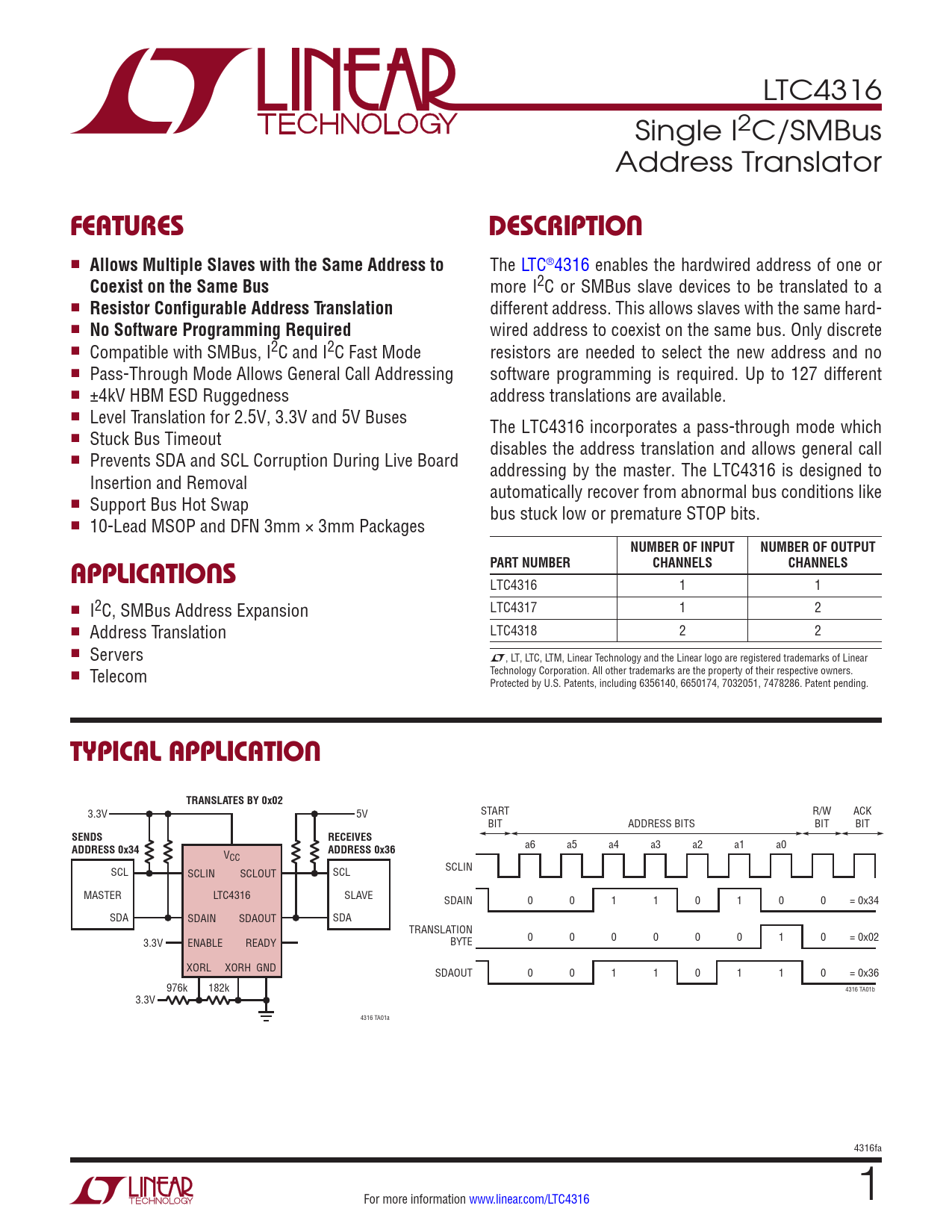 LTC4316 Single I2C/SMBus Address Translator FEATURESDESCRIPTION n Allows Multiple Slaves with the Same Address to The LTC®4316 enables the hardwired address of one or Coexist on the Same Bus more I2C or SMBus slave devices to be translated to a n Resistor Configurable Address Translation different address. This allows slaves with the same hard- n No Software Programming Required wired address to coexist on the same bus. Only discrete n Compatible with SMBus, I2C and I2C Fast Mode resistors are needed to select the new address and no n Pass-Through Mode Allows General Call Addressing software programming is required. Up to 127 different n ±4kV HBM ESD Ruggedness address translations are available. n Level Translation for 2.5V, 3.3V and 5V Buses The LTC4316 incorporates a pass-through mode which n Stuck Bus Timeout disables the address translation and allows general call n Prevents SDA and SCL Corruption During Live Board addressing by the master. The LTC4316 is designed to Insertion and Removal automatically recover from abnormal bus conditions like n Support Bus Hot Swap bus stuck low or premature STOP bits. n 10-Lead MSOP and DFN 3mm × 3mm Packages NUMBER OF INPUTNUMBER OF OUTPUTPART NUMBERCHANNELSCHANNELSAPPLICATIONS LTC4316 1 1 n LTC4317 1 2 I2C, SMBus Address Expansion n LTC4318 2 2 Address Translation n Servers L, LT, LTC, LTM, Linear Technology and the Linear logo are registered trademarks of Linear Technology Corporation. All other trademarks are the property of their respective owners. n Telecom Protected by U.S. Patents, including 6356140, 6650174, 7032051, 7478286. Patent pending. TYPICAL APPLICATIONTRANSLATES BY 0x02 3.3V 5V START R/W ACK BIT ADDRESS BITS BIT BIT SENDSRECEIVESADDRESS 0x34ADDRESS 0x36 a6 a5 a4 a3 a2 a1 a0 VCC SCL SCLIN SCLOUT SCL SCLIN MASTER LTC4316 SLAVE SDAIN 0 0 1 1 0 1 0 0 = 0x34 SDA SDAIN SDAOUT SDA TRANSLATION 3.3V ENABLE READY BYTE 0 0 0 0 0 0 1 0 = 0x02 XORL XORH GND SDAOUT 0 0 1 1 0 1 1 0 = 0x36 976k 182k 4316 TA01b 3.3V 4316 TA01a 4316fa For more information www.linear.com/LTC4316 1