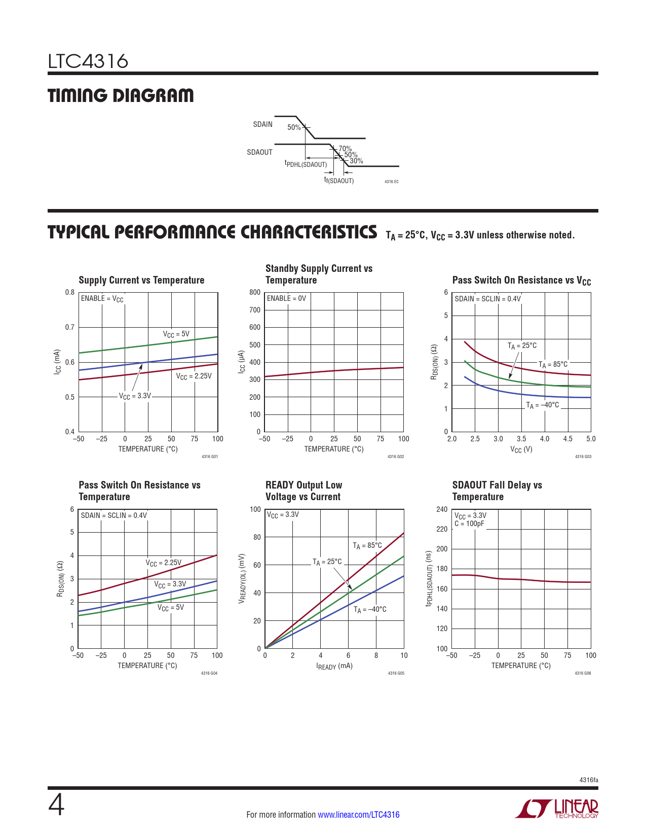 0.8 800 6 ENABLE = VCC ENABLE = 0V SDAIN = SCLIN = 0.4V 700 5 0.7 600 VCC = 5V 4 500 TA = 25°C (Ω) (mA) 0.6 (µA) 400 3 TA = 85°C I CC V I CC CC = 2.25V 300 R DS(ON) 2 0.5 VCC = 3.3V 200 1 TA = –40°C 100 0.4 0 0 –50 –25 0 25 50 75 100 –50 –25 0 25 50 75 100 2.0 2.5 3.0 3.5 4.0 4.5 5.0 TEMPERATURE (°C) TEMPERATURE (°C) VCC (V) 4316 G01 4316 G02 4316 G03