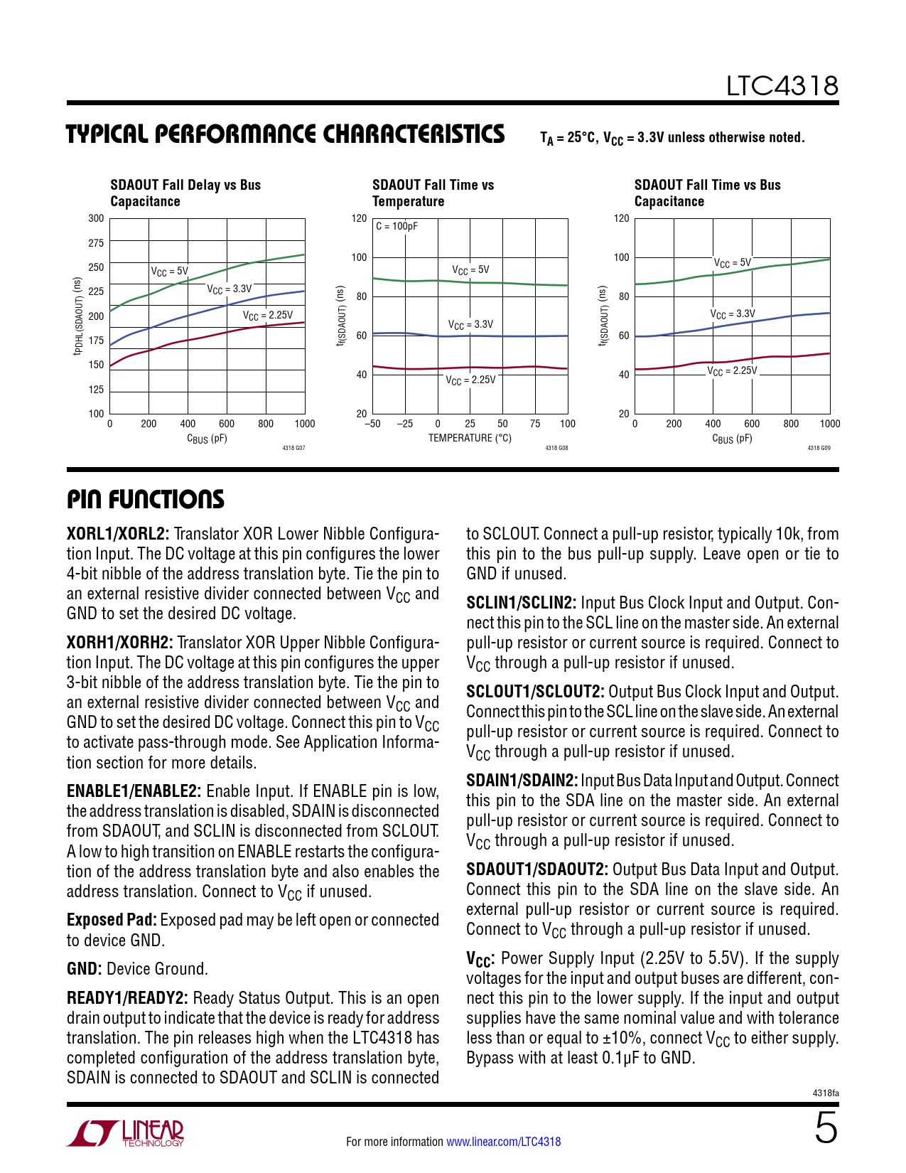 300 120 120 C = 100pF 275 100 100 250 V V CC = 5V CC = 5V VCC = 5V (ns) 225 VCC = 3.3V (ns) 80 (ns) 80 200 VCC = 2.25V VCC = 3.3V VCC = 3.3V 175 60 60 t f(SDAOUT) t f(SDAOUT) t PDHL(SDAOUT) 150 40 V V 40 CC = 2.25V CC = 2.25V 125 100 20 20 0 200 400 600 800 1000 –50 –25 0 25 50 75 100 0 200 400 600 800 1000 CBUS (pF) TEMPERATURE (°C) CBUS (pF) 4318 G07 4318 G08 4318 G09
