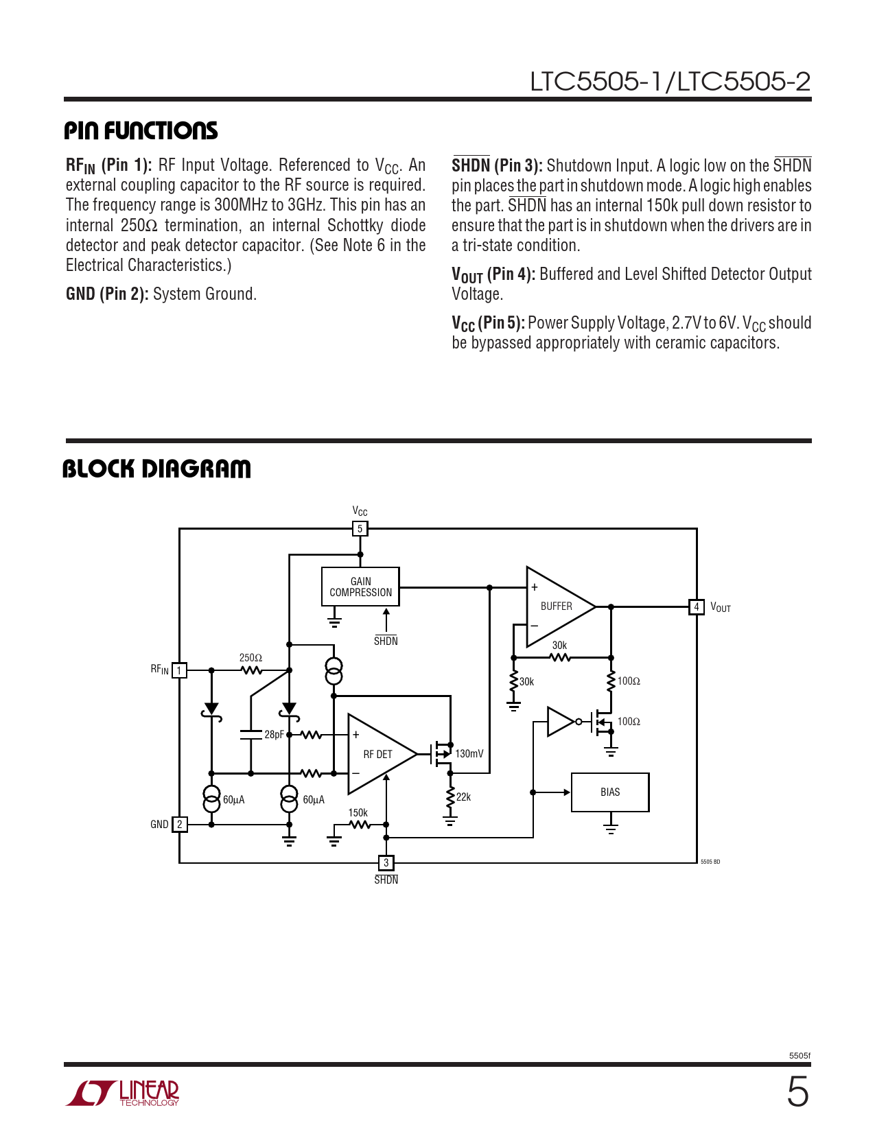 VCC 5 GAIN + COMPRESSION BUFFER 4 VOUT – SHDN 30k 250Ω RFIN 1 30k 100Ω 100Ω 28pF + RF DET 130mV – BIAS 60µA 60µA 22k 150k GND 2 5505 BD 3 SHDN 5505f 5