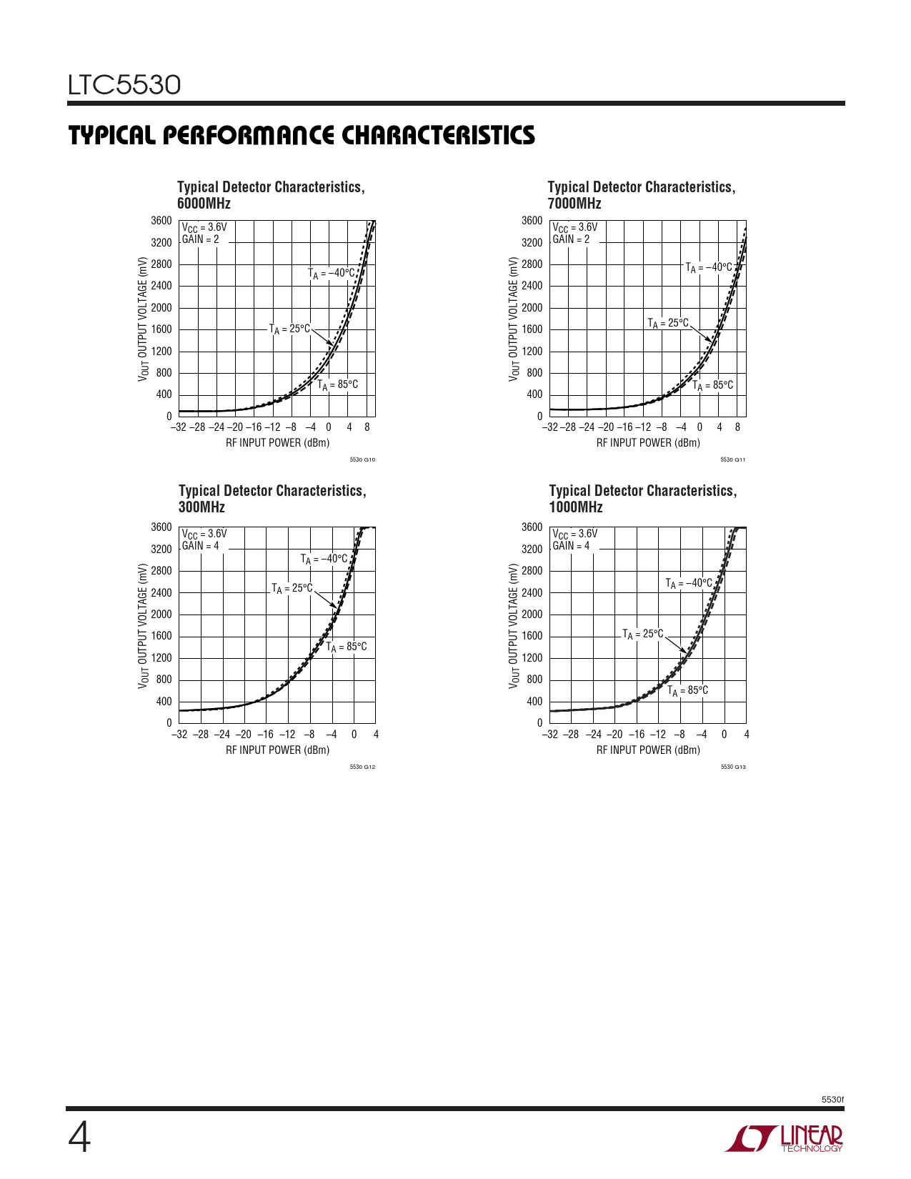 3600 3600 VCC = 3.6V VCC = 3.6V 3200 GAIN = 4 3200 GAIN = 4 TA = –40°C 2800 2800 TA = –40°C 2400 TA = 25°C 2400 2000 2000 1600 1600 TA = 25°C TA = 85°C 1200 1200 OUTPUT VOLTAGE (mV) OUTPUT VOLTAGE (mV) OUT 800 OUT 800 V V TA = 85°C 400 400 0 0 –32 –28 –24 –20 –16 –12 –8 –4 0 4 –32 –28 –24 –20 –16 –12 –8 –4 0 4 RF INPUT POWER (dBm) RF INPUT POWER (dBm) 5530 G12 5530 G13 5530f 4