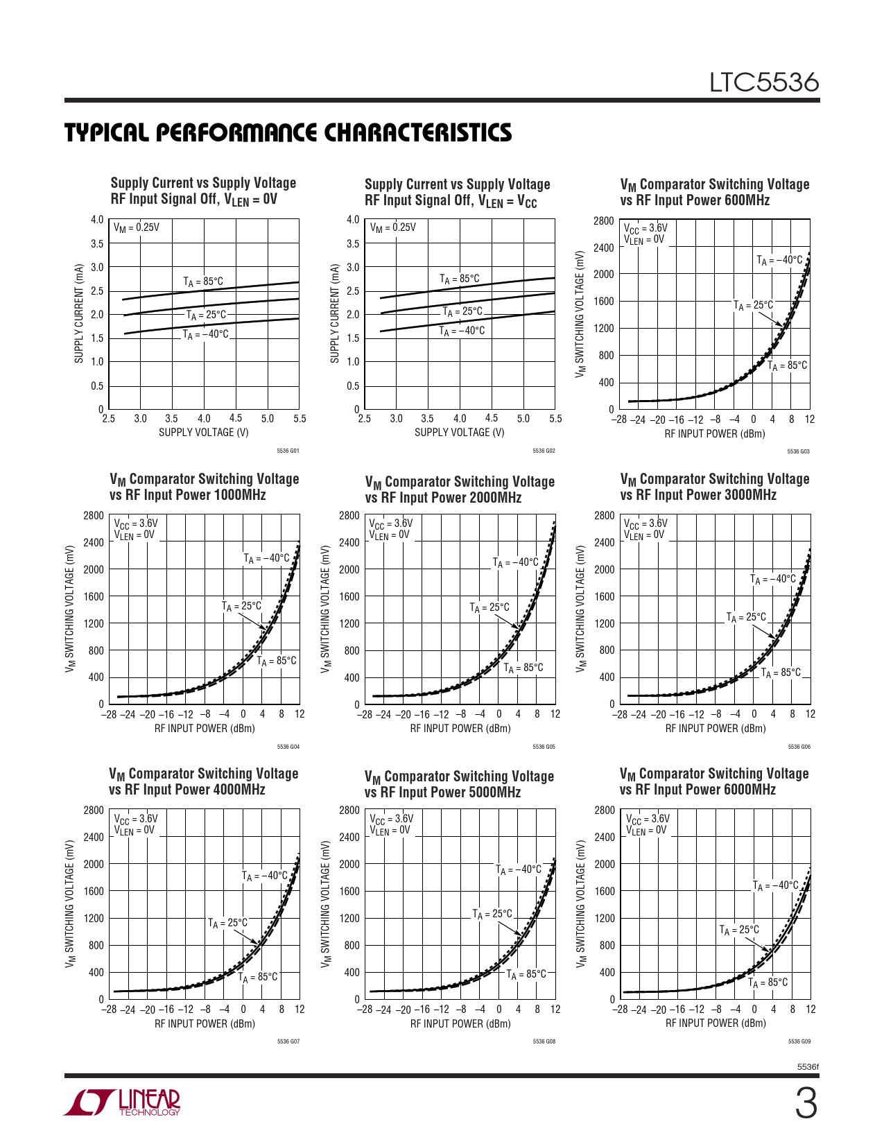 LTC5536 WUTYPICAL PERFOR A CE CHARACTERISTICSSupply Current vs Supply VoltageSupply Current vs Supply VoltageVM Comparator Switching VoltageRF Input Signal Off, VLEN = 0VRF Input Signal Off, VLEN = VCCvs RF Input Power 600MHz 4.0 4.0 2800 V V M = 0.25V M = 0.25V VCC = 3.6V VLEN = 0V 3.5 3.5 2400 T 3.0 3.0 A = – 40°C 2000 T T A = 85°C A = 85°C 2.5 2.5 1600 TA = 25°C 2.0 T 2.0 T A = 25°C A = 25°C 1200 TA = –40°C 1.5 TA = –40°C 1.5 800 SUPPLY CURRENT (mA) 1.0 SUPPLY CURRENT (mA) 1.0 SWITCHING VOLTAGE (mV) T M A = 85°C V 400 0.5 0.5 0 0 0 2.5 3.0 3.5 4.0 4.5 5.0 5.5 2.5 3.0 3.5 4.0 4.5 5.0 5.5 –28 –24 –20 –16 –12 –8 –4 0 4 8 12 SUPPLY VOLTAGE (V) SUPPLY VOLTAGE (V) RF INPUT POWER (dBm) 5536 G01 5536 G02 5536 G03 VM Comparator Switching VoltageVVM Comparator Switching VoltageM Comparator Switching Voltagevs RF Input Power 1000MHzvs RF Input Power 2000MHzvs RF Input Power 3000MHz 2800 2800 2800 V V V CC = 3.6V CC = 3.6V CC = 3.6V V V V LEN = 0V LEN = 0V LEN = 0V 2400 2400 2400 TA = –40°C T 2000 A = – 40°C 2000 2000 TA = –40°C 1600 1600 1600 TA = 25°C TA = 25°C T 1200 1200 1200 A = 25°C 800 800 800 SWITCHING VOLTAGE (mV) SWITCHING VOLTAGE (mV) SWITCHING VOLTAGE (mV) M TA = 85°C M M V V TA = 85°C V T 400 400 400 A = 85°C 0 0 0 –28 –24 –20 –16 –12 –8 –4 0 4 8 12 –28 –24 –20 –16 –12 –8 –4 0 4 8 12 –28 –24 –20 –16 –12 –8 –4 0 4 8 12 RF INPUT POWER (dBm) RF INPUT POWER (dBm) RF INPUT POWER (dBm) 5536 G04 5536 G05 5536 G06 VM Comparator Switching VoltageVVM Comparator Switching VoltageM Comparator Switching Voltagevs RF Input Power 4000MHzvs RF Input Power 5000MHzvs RF Input Power 6000MHz 2800 2800 2800 VCC = 3.6V VCC = 3.6V VCC = 3.6V VLEN = 0V VLEN = 0V VLEN = 0V 2400 2400 2400 2000 2000 2000 TA = –40°C TA = –40°C T 1600 1600 1600 A = – 40°C 1200 T 1200 A = 25°C 1200 TA = 25°C TA = 25°C 800 800 800 SWITCHING VOLTAGE (mV) SWITCHING VOLTAGE (mV) SWITCHING VOLTAGE (mV) M M M V V V 400 400 T 400 T A = 85°C A = 85°C TA = 85°C 0 0 0 –28 –24 –20 –16 –12 –8 –4 0 4 8 12 –28 –24 –20 –16 –12 –8 –4 0 4 8 12 –28 –24 –20 –16 –12 –8 –4 0 4 8 12 RF INPUT POWER (dBm) RF INPUT POWER (dBm) RF INPUT POWER (dBm) 5536 G07 5536 G08 5536 G09 5536f 3