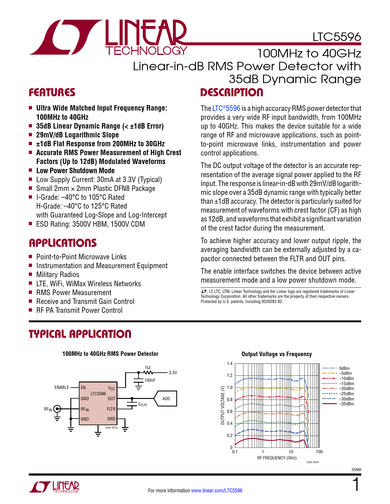 LTC5596 100MHz to 40GHz Linear-in-dB RMS Power Detector with 35dB Dynamic Range FeaTuresDescripTion n Ultra Wide Matched Input Frequency Range: The LTC®5596 is a high accuracy RMS power detector that 100MHz to 40GHz provides a very wide RF input bandwidth, from 100MHz n 35dB Linear Dynamic Range (< ±1dB Error) up to 40GHz. This makes the device suitable for a wide n 29mV/dB Logarithmic Slope range of RF and microwave applications, such as point- n ±1dB Flat Response from 200MHz to 30GHz to-point microwave links, instrumentation and power n Accurate RMS Power Measurement of High Crest control applications. Factors (Up to 12dB) Modulated Waveforms The DC output voltage of the detector is an accurate rep- n Low Power Shutdown Mode resentation of the average signal power applied to the RF n Low Supply Current: 30mA at 3.3V (Typical) input. The response is linear-in-dB with 29mV/dB logarith- n Small 2mm × 2mm Plastic DFN8 Package mic slope over a 35dB dynamic range with typically better n I-Grade: –40°C to 105°C Rated than ±1dB accuracy. The detector is particularly suited for H-Grade: –40°C to 125°C Rated measurement of waveforms with crest factor (CF) as high with Guaranteed Log-Slope and Log-Intercept as 12dB, and waveforms that exhibit a significant variation n ESD Rating: 3500V HBM, 1500V CDM of the crest factor during the measurement. To achieve higher accuracy and lower output ripple, the applicaTions averaging bandwidth can be externally adjusted by a ca- n Point-to-Point Microwave Links pacitor connected between the FLTR and OUT pins. n Instrumentation and Measurement Equipment n The enable interface switches the device between active Military Radios n measurement mode and a low power shutdown mode. LTE, WiFi, WiMax Wireless Networks L n , LT, LTC, LTM, Linear Technology and the Linear logo are registered trademarks of Linear RMS Power Measurement Technology Corporation. All other trademarks are the property of their respective owners. n Receive and Transmit Gain Control Protected by U.S. patents, including 9330283 B2. n RF PA Transmit Power Control Typical applicaTion100MHz to 40GHz RMS Power DetectorOutput Voltage vs Frequency 1.4 1Ω 0dBm 3.3V 1.2 –5dBm 100nF –10dBm –15dBm ENABLE EN VCC 1.0 –20dBm LTC5596 –25dBm GND OUT ADC TAGE (V) 0.8 –30dBm CFLTR –35dBm RFIN RFIN FLTR 0.6 GND GND OUTPUT VOL 0.4 5596 TA01a 0.2 00.1 1 10 100 RF FREQUENCY (GHz) 5596 TA01b 5596f For more information www.linear.com/LTC5596 1 Document Outline Features Description Applications Typical Application Absolute Maximum Ratings Pin Configuration Order Information Electrical Characteristics Typical Performance Characteristics Pin Functions Test Circuit Applications Information Package Description Typical Application Related Parts