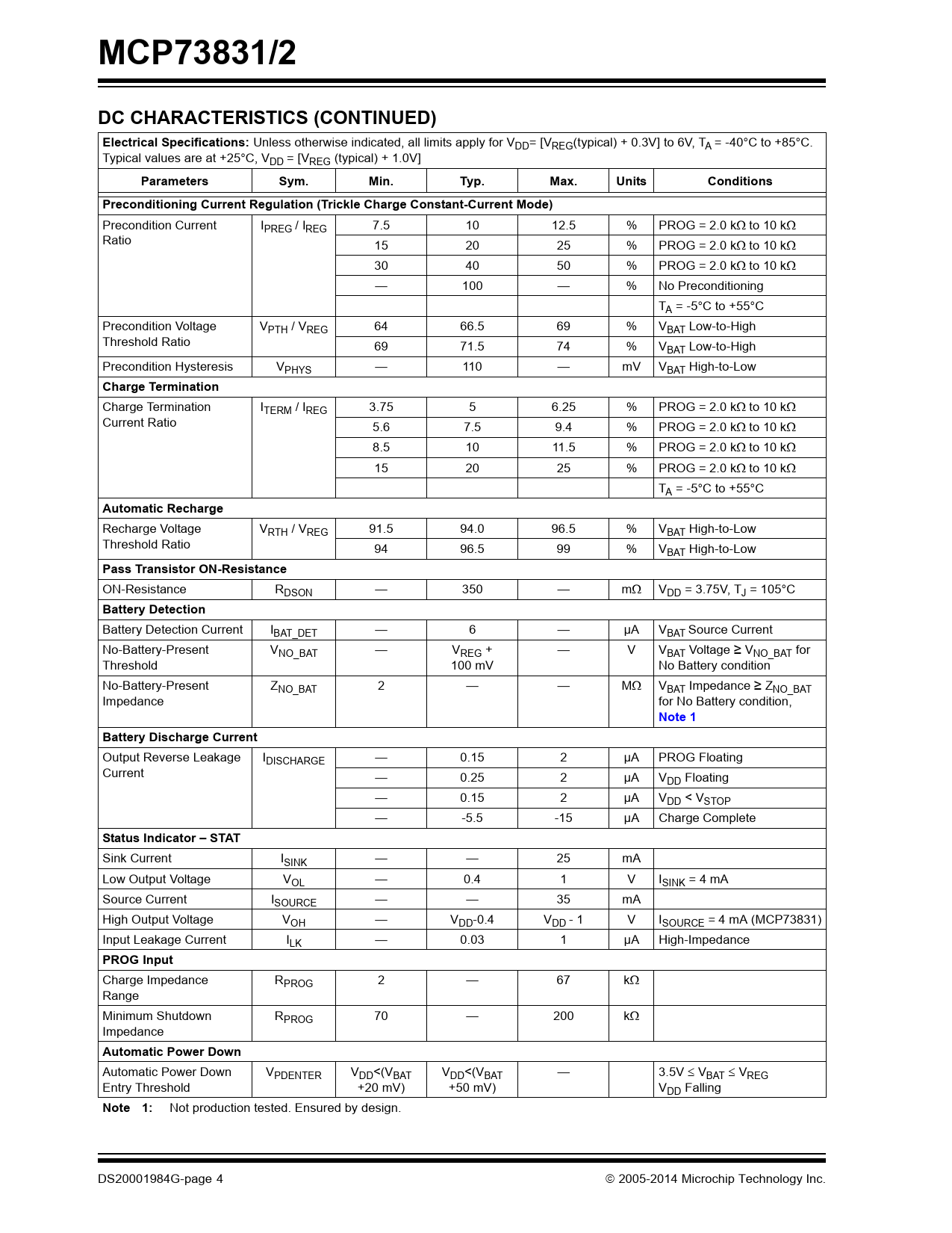 | Pages / Page | 28 / 4 — MCP73831/2. DC CHARACTERISTICS (CONTINUED). Electrical Specifications:. … |