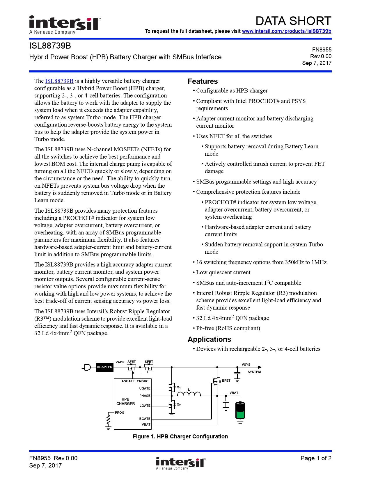 DATA SHORT To request the full datasheet, please visit www.intersil.com/products/isl88739b ISL88739B FN8955 Hybrid Power Boost (HPB) Battery Charger with SMBus Interface Rev.0.00 Sep 7, 2017 The ISL88739B is a highly versatile battery charger