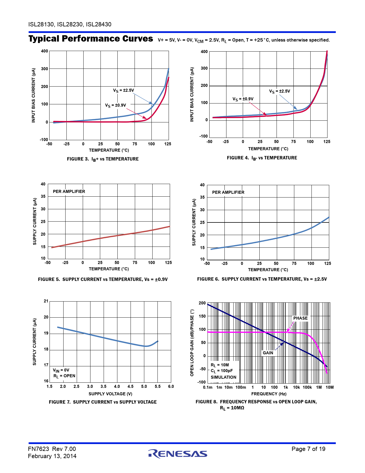 FIGURE 7. SUPPLY CURRENT vs SUPPLY VOLTAGE FIGURE 8. FREQUENCY RESPONSE vs OPEN LOOP GAIN, RL = 10MΩ FN7623 Rev 7.00 Page 7 of 19 February 13, 2014