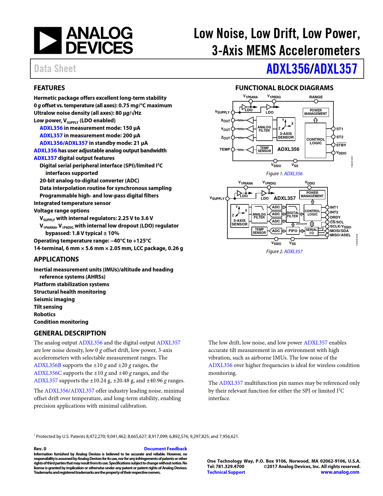 Low Noise, Low Drift, Low Power,. 3-Axis MEMS Accelerometers. Data Sheet. ADXL356/. ADXL357. FEATURES. FUNCTIONAL BLOCK DIAGRAMS