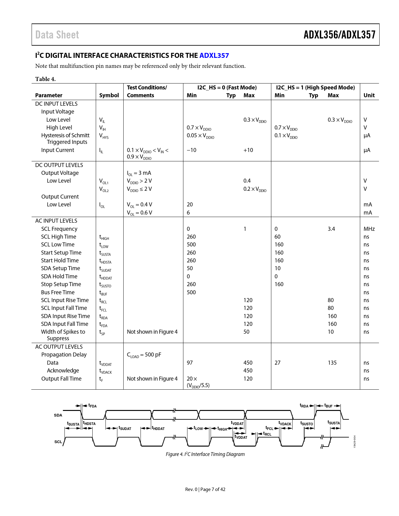 link to page 7 link to page 7 Data SheetADXL356/ADXL357I2C DIGITAL INTERFACE CHARACTERISTICS FOR THE ADXL357 Note that multifunction pin names may be referenced only by their relevant function. Table 4.Test Conditions/I2C_HS = 0 (Fast Mode)I2C_HS = 1 (High Speed Mode)ParameterSymbolCommentsMinTyp MaxMinTypMaxUnit DC INPUT LEVELS Input Voltage Low Level V 0.3 × V 0.3 × V V IL DDIO DDIO High Level V 0.7 × V 0.7 × V V IH DDIO DDIO Hysteresis of Schmitt V 0.05 × V 0.1 × V µA HYS DDIO DDIO Triggered Inputs Input Current I 0.1 × V < V < −10 +10 µA IL DDIO IN 0.9 × V DDIO DC OUTPUT LEVELS Output Voltage I = 3 mA OL Low Level V V > 2 V 0.4 V OL1 DDIO V V ≤ 2 V 0.2 × V V OL2 DDIO DDIO Output Current Low Level I V = 0.4 V 20 mA OL OL V = 0.6 V 6 mA OL AC INPUT LEVELS SCL Frequency 0 1 0 3.4 MHz SCL High Time t 260 60 ns HIGH SCL Low Time t 500 160 ns LOW Start Setup Time t 260 160 ns SUSTA Start Hold Time t 260 160 ns HDSTA SDA Setup Time t 50 10 ns SUDAT SDA Hold Time t 0 0 ns HDDAT Stop Setup Time t 260 160 ns SUSTO Bus Free Time t 500 ns BUF SCL Input Rise Time t 120 80 ns RCL SCL Input Fall Time t 120 80 ns FCL SDA Input Rise Time t 120 160 ns RDA SDA Input Fall Time t 120 160 ns FDA Width of Spikes to t Not shown in Figure 4 50 10 ns SP Suppress AC OUTPUT LEVELS Propagation Delay C = 500 pF LOAD Data t 97 450 27 135 ns VDDAT Acknowledge t 450 ns VDACK Output Fall Time t Not shown in Figure 4 20 × 120 ns F (V /5.5) DDIO ttFDAtRDABUFSDAtttVDDATttHDSTASUSTAVDACKtSUSTOSUSTAtSUDATtHDDATtLOWttHIGHFCLtRCLtVDDAT 004 SCL 15429- Figure 4. I2C Interface Timing Diagram Rev. 0 | Page 7 of 42 Document Outline Features Applications Functional Block Diagrams General Description Revision History Specifications Analog Output for the ADXL356 Digital Output for the ADXL357 SPI Digital Interface Characteristics for the ADXL357 I2C Digital Interface Characteristics for the ADXL357 Absolute Maximum Ratings Thermal Resistance Recommended Soldering Profile ESD Caution Pin Configurations and Function Descriptions Typical Performance Characteristics Root Allan Variance (RAV) ADXL357 Characteristics Theory of Operation Applications Information Analog Output Digital Output Axes of Acceleration Sensitivity Power Sequencing Power Supply Description VSUPPLY V1P8ANA V1P8DIG VDDIO Overrange Protection Self Test Filter Serial Communications SPI Protocol I2C Protocol Reading Acceleration or Temperature Data from the Interface FIFO Interrupts DATA_RDY DRDY Pin FIFO_FULL FIFO_OVR Activity NVM_BUSY External Synchronization and Interpolation EXT_SYNC = 00—No External Sync or Interpolation EXT_SYNC = 10—External Sync with Interpolation EXT_SYNC = 01—External Sync and External Clock, No Interpolation Filter ADXL357 Register Map Register Definitions Analog Devices ID Register Address: 0x00, Reset: 0xAD, Name: DEVID_AD Analog Devices MEMS ID Register Address: 0x01, Reset: 0x1D, Name: DEVID_MST Device ID Register Address: 0x02, Reset: 0xED, Name: PARTID Product Revision ID Register Address: 0x03, Reset: 0x01, Name: REVID Status Register Address: 0x04, Reset: 0x00, Name: Status FIFO Entries Register Address: 0x05, Reset: 0x00, Name: FIFO_ENTRIES Temperature Data Registers Address: 0x06, Reset: 0x00, Name: TEMP2 Address: 0x07, Reset: 0x00, Name: TEMP1 X-Axis Data Registers Address: 0x08, Reset: 0x00, Name: XDATA3 Address: 0x09, Reset: 0x00, Name: XDATA2 Address: 0x0A, Reset: 0x00, Name: XDATA1 Y-Axis Data Registers Address: 0x0B, Reset: 0x00, Name: YDATA3 Address: 0x0C, Reset: 0x00, Name: YDATA2 Address: 0x0D, Reset: 0x00, Name: YDATA1 Z-Axis Data Registers Address: 0x0E, Reset: 0x00, Name: ZDATA3 Address: 0x0F, Reset: 0x00, Name: ZDATA2 Address: 0x10, Reset: 0x00, Name: ZDATA1 FIFO Access Register Address: 0x11, Reset: 0x00, Name: FIFO_DATA X-Axis Offset Trim Registers Address: 0x1E, Reset: 0x00, Name: OFFSET_X_H Address: 0x1F, Reset: 0x00, Name: OFFSET_X_L Y-Axis Offset Trim Registers Address: 0x20, Reset: 0x00, Name: OFFSET_Y_H Address: 0x21, Reset: 0x00, Name: OFFSET_Y_L Z-Axis Offset Trim Registers Address: 0x22, Reset: 0x00, Name: OFFSET_Z_H Address: 0x23, Reset: 0x00, Name: OFFSET_Z_L Activity Enable Register Address: 0x24, Reset: 0x00, Name: ACT_EN Activity Threshold Registers Address: 0x25, Reset: 0x00, Name: ACT_THRESH_H Address: 0x26, Reset: 0x00, Name: ACT_THRESH_L Activity Count Register Address: 0x27, Reset: 0x01, Name: ACT_COUNT Filter Settings Register Address: 0x28, Reset: 0x00, Name: Filter FIFO Samples Register Address: 0x29, Reset: 0x60, Name: FIFO_SAMPLES Interrupt Pin (INTx) Function Map Register Address: 0x2A, Reset: 0x00, Name: INT_MAP Data Synchronization Address: 0x2B, Reset: 0x00, Name: Sync I2C Speed, Interrupt Polarity, and Range Register Address: 0x2C, Reset: 0x81, Name: Range Power Control Register Address: 0x2D, Reset: 0x01, Name: POWER_CTL Self Test Register Address: 0x2E, Reset: 0x00, Name: SELF_TEST Reset Register Address: 0x2F, Reset: 0x00, Name: Reset PCB Footprint Pattern Outline Dimensions Ordering Guide