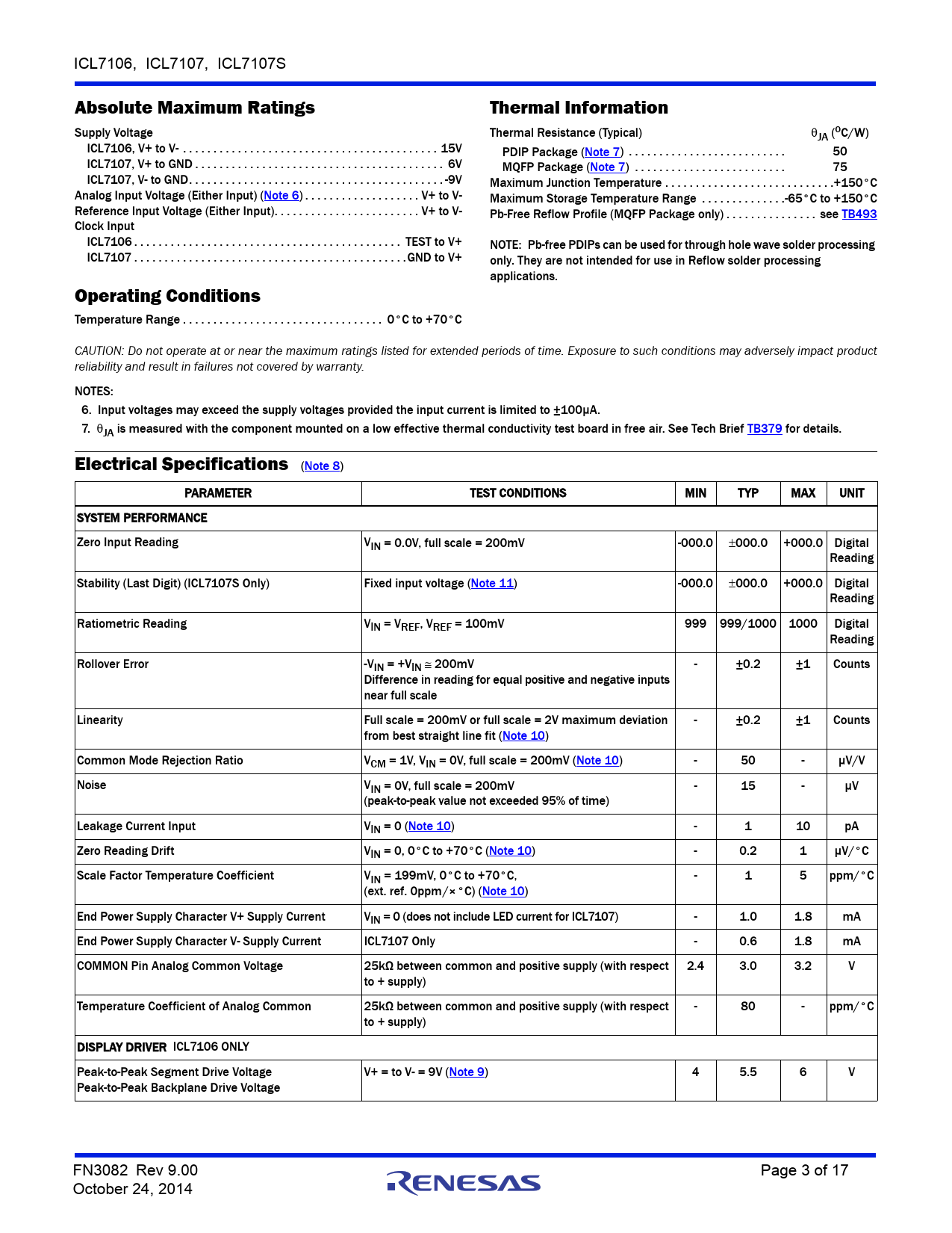 link to page 3 link to page 3 link to page 3 link to page 4 link to page 4 link to page 4 link to page 4 link to page 4 link to page 4 link to page 4 link to page 4 ICL7106, ICL7107, ICL7107S Absolute Maximum Ratings Thermal Information Supply Voltage Thermal Resistance (Typical) JA (oC/W) ICL7106, V+ to V- . 15V PDIP Package (Note 7) . 50 ICL7107, V+ to GND . 6V MQFP Package (Note 7) . 75 ICL7107, V- to GND. -9V Maximum Junction Temperature . .+150°C Analog Input Voltage (Either Input) (Note 6) . V+ to V- Maximum Storage Temperature Range . .-65°C to +150°C Reference Input Voltage (Either Input). V+ to V- Pb-Free Reflow Profile (MQFP Package only) . see TB493 Clock Input ICL7106 . TEST to V+ NOTE: Pb-free PDIPs can be used for through hole wave solder processing ICL7107 . .GND to V+ only. They are not intended for use in Reflow solder processing applications. Operating Conditions Temperature Range . 0°C to +70°C CAUTION: Do not operate at or near the maximum ratings listed for extended periods of time. Exposure to such conditions may adversely impact product reliability and result in failures not covered by warranty. NOTES: 6. Input voltages may exceed the supply voltages provided the input current is limited to ±100µA. 7. JA is measured with the component mounted on a low effective thermal conductivity test board in free air. See Tech Brief TB379 for details. Electrical Specifications (Note 8) PARAMETER TEST CONDITIONS MIN TYP MAX UNIT SYSTEM PERFORMANCE Zero Input Reading VIN = 0.0V, full scale = 200mV -000.0 000.0 +000.0 Digital Reading Stability (Last Digit) (ICL7107S Only) Fixed input voltage (Note 11) -000.0 000.0 +000.0 Digital Reading Ratiometric Reading VlN = VREF, VREF = 100mV 999 999/1000 1000 Digital Reading Rollover Error -VIN = +VlN 200mV - ±0.2 ±1 Counts Difference in reading for equal positive and negative inputs near full scale Linearity Full scale = 200mV or full scale = 2V maximum deviation - ±0.2 ±1 Counts from best straight line fit (Note 10) Common Mode Rejection Ratio VCM = 1V, VIN = 0V, full scale = 200mV (Note 10) - 50 - µV/V Noise VIN = 0V, full scale = 200mV - 15 - µV (peak-to-peak value not exceeded 95% of time) Leakage Current Input VlN = 0 (Note 10) - 1 10 pA Zero Reading Drift VlN = 0, 0°C to +70°C (Note 10) - 0.2 1 µV/°C Scale Factor Temperature Coefficient VIN = 199mV, 0°C to +70°C, - 1 5 ppm/°C (ext. ref. 0ppm/×°C) (Note 10) End Power Supply Character V+ Supply Current VIN = 0 (does not include LED current for ICL7107) - 1.0 1.8 mA End Power Supply Character V- Supply Current ICL7107 Only - 0.6 1.8 mA COMMON Pin Analog Common Voltage 25kΩ between common and positive supply (with respect 2.4 3.0 3.2 V to + supply) Temperature Coefficient of Analog Common 25kΩ between common and positive supply (with respect - 80 - ppm/°C to + supply) DISPLAY DRIVER ICL7106 ONLY Peak-to-Peak Segment Drive Voltage V+ = to V- = 9V (Note 9) 4 5.5 6 V Peak-to-Peak Backplane Drive Voltage FN3082 Rev 9.00 Page 3 of 17 October 24, 2014
