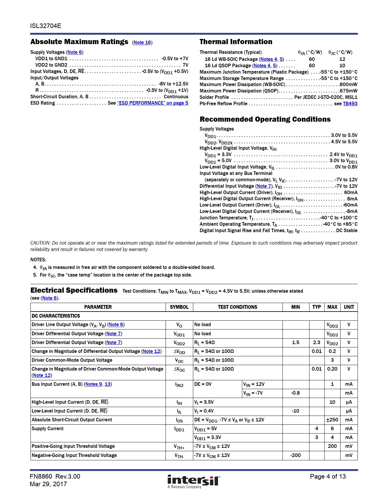 link to page 5 link to page 5 link to page 5 link to page 4 link to page 4 link to page 5 link to page 5 link to page 5 link to page 5 link to page 5 link to page 5 link to page 5 link to page 5 link to page 5 link to page 4 link to page 4 ISL32704E Absolute Maximum Ratings (Note 16) Thermal Information Supply Voltages (Note 6) Thermal Resistance (Typical) JA (°C/W) JC (°C/W) VDD1 to GND1 . -0.5V to +7V 16 Ld WB-SOIC Package (Notes 4, 5) . 60 12 VDD2 to GND2 . 7V 16 Ld QSOP Package (Notes 4, 5) . 60 10 Input Voltages, D, DE, RE. -0.5V to (VDD1 +0.5V) Maximum Junction Temperature (Plastic Package) . .-55°C to +150°C Input/Output Voltages Maximum Storage Temperature Range . .-55°C to +150°C A, B . -8V to +12.5V Maximum Power Dissipation (WB-SOIC) . .800mW R . -0.5V to (VDD1 +1V) Maximum Power Dissipation (QSOP). .675mW Short-Circuit Duration, A, B . Continuous Solder Profile . Per JEDEC J-STD-020C, MSL1 ESD Rating . See “ESD PERFORMANCE” on page 5 Pb-Free Reflow Profile . see TB493 Recommended Operating Conditions Supply Voltages VDD1. 3.0V to 5.5V VDD2, VDD2X . 4.5V to 5.5V High-Level Digital Input Voltage, VIH VDD1 = 3.3V . 2.4V to VDD1 VDD1 = 5.0V . 3.0V to VDD1 Low-Level Digital Input Voltage, VIL . .0V to 0.8V Input Voltage at any Bus Terminal (separately or common-mode), VI, VIC . .-7V to 12V Differential Input Voltage (Note 7), VID . .-7V to 12V High-Level Output Current (Driver), IOH . 60mA High-Level Digital Output Current (Receiver), IOH. 8mA Low-Level Output Current (Driver), IOL . -60mA Low-Level Digital Output Current (Receiver), IOL . -8mA Junction Temperature, TJ . .-40°C to +100°C Ambient Operating Temperature, TA . .-40°C to +85°C Digital Input Signal Rise and Fall Times, tIR, tIF . DC Stable CAUTION: Do not operate at or near the maximum ratings listed for extended periods of time. Exposure to such conditions may adversely impact product reliability and result in failures not covered by warranty. NOTES: 4. JA is measured in free air with the component soldered to a double-sided board. 5. For JC, the “case temp” location is the center of the package top side. Electrical Specifications Test Conditions: TMIN to TMAX, VDD1 = VDD2 = 4.5V to 5.5V; unless otherwise stated (see (Note 6). PARAMETER SYMBOL TEST CONDITIONS MIN TYP MAX UNIT DC CHARACTERISTICS Driver Line Output Voltage (VA, VB) (Note 6) VO No load VDD2 V Driver Differential Output Voltage (Note 7) VOD1 No load VDD2 V Driver Differential Output Voltage (Note 7) VOD2 RL = 54Ω 1.5 2.3 VDD2 V Change in Magnitude of Differential Output Voltage (Note 12) VOD RL = 54Ω or 100Ω 0.01 0.2 V Driver Common-Mode Output Voltage VOC RL = 54Ω or 100Ω 3 V Change in Magnitude of Driver Common-Mode Output Voltage VOC RL = 54Ω or 100Ω 0.01 0.20 V (Note 12) Bus Input Current (A, B) (Notes 9, 13) IIN2 DE = 0V VIN = 12V 1 mA VIN = -7V -0.8 mA High-Level Input Current (D, DE, RE) IIH VI = 3.5V 10 µA Low-Level Input Current (D, DE, RE) IIL VI = 0.4V -10 µA Absolute Short-Circuit Output Current IOS DE = VDD1, -7V ≤ VA or VB ≤ 12V ±250 mA Supply Current IDD1 VDD1 = 5V 4 6 mA VDD1 = 3.3V 3 4 mA Positive-Going Input Threshold Voltage VTH+ -7V ≤ VCM ≤ 12V 200 mV Negative-Going Input Threshold Voltage VTH- -7V ≤ VCM ≤ 12V -200 mV FN8860 Rev.3.00 Page 4 of 13 Mar 29, 2017 Document Outline Related Literature Features Applications Ordering Information Pin Configurations Truth Table Truth Table Pin Descriptions Typical Operating Circuits Absolute Maximum Ratings (Note 16) Thermal Information Recommended Operating Conditions Electrical Specifications Insulation Specifications Magnetic Field Immunity (Note 16) Safety and Approvals VDE V 0884-11 (Certification Pending) UL 1577 Electromagnetic Compatibility Application Information RS-485 and Isolation Digital Isolator Principle GMR Resistor in Detail Low Emissions Low EMI Susceptibility Receiver (Rx) Features Driver (Tx) Features Built-In Driver Overload Protection Dynamic Power Consumption Power Supply Decoupling DC Correctness Data Rate, Cables, and Terminations Transient Protection Pinout Differences Between Packages Revision History About Intersil Package Outline Drawing M16.15B M16.3A