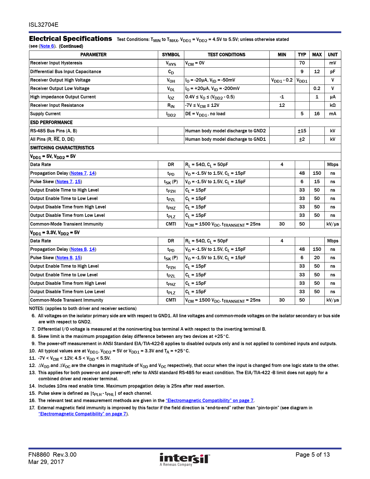 link to page 5 link to page 5 link to page 5 link to page 5 link to page 5 link to page 5 link to page 5 link to page 5 link to page 7 link to page 7 ISL32704E Electrical Specifications Test Conditions: TMIN to TMAX, VDD1 = VDD2 = 4.5V to 5.5V; unless otherwise stated (see (Note 6). (Continued) PARAMETER SYMBOL TEST CONDITIONS MIN TYP MAX UNIT Receiver Input Hysteresis VHYS VCM = 0V 70 mV Differential Bus Input Capacitance CD 9 12 pF Receiver Output High Voltage VOH IO = -20µA, VID = -50mV VDD1 - 0.2 VDD1 V Receiver Output Low Voltage VOL IO = +20µA, VID = -200mV 0.2 V High impedance Output Current IOZ 0.4V ≤ VO ≤ (VDD2 - 0.5) -1 1 µA Receiver Input Resistance RIN -7V ≤ VCM ≤ 12V 12 kΩ Supply Current IDD2 DE = VDD1, no load 5 16 mA ESD PERFORMANCE RS-485 Bus Pins (A, B) Human body model discharge to GND2 ±15 kV All Pins (R, RE, D, DE) Human body model discharge to GND1 ±2 kV SWITCHING CHARACTERISTICS VDD1 = 5V, VDD2 = 5V Data Rate DR RL = 54Ω, CL = 50pF 4 Mbps Propagation Delay (Notes 7, 14) tPD VO = -1.5V to 1.5V, CL = 15pF 48 150 ns Pulse Skew (Notes 7, 15) tSK (P) VO = -1.5V to 1.5V, CL = 15pF 6 15 ns Output Enable Time to High Level tPZH CL = 15pF 33 50 ns Output Enable Time to Low Level tPZL CL = 15pF 33 50 ns Output Disable Time from High Level tPHZ CL = 15pF 33 50 ns Output Disable Time from Low Level tPLZ CL = 15pF 33 50 ns Common-Mode Transient Immunity CMTI VCM = 1500 VDC, tTRANSIENT = 25ns 30 50 kV/µs VDD1 = 3.3V, VDD2 = 5V Data Rate DR RL = 54Ω, CL = 50pF 4 Mbps Propagation Delay (Notes 8, 14) tPD VO = -1.5V to 1.5V, CL = 15pF 48 150 ns Pulse Skew (Notes 8, 15) tSK (P) VO = -1.5V to 1.5V, CL = 15pF 6 20 ns Output Enable Time to High Level tPZH CL = 15pF 33 50 ns Output Enable Time to Low Level tPZL CL = 15pF 33 50 ns Output Disable Time from High Level tPHZ CL = 15pF 33 50 ns Output Disable Time from Low Level tPLZ CL = 15pF 33 50 ns Common-Mode Transient Immunity CMTI VCM = 1500 VDC, tTRANSIENT = 25ns 30 50 kV/µs NOTES: (applies to both driver and receiver sections) 6. All voltages on the isolator primary side are with respect to GND1. All line voltages and common-mode voltages on the isolator secondary or bus side are with respect to GND2. 7. Differential I/O voltage is measured at the noninverting bus terminal A with respect to the inverting terminal B. 8. Skew limit is the maximum propagation delay difference between any two devices at +25°C. 9. The power-off measurement in ANSI Standard EIA/TIA-422-B applies to disabled outputs only and is not applied to combined inputs and outputs. 10. All typical values are at VDD1, VDD2 = 5V or VDD1 = 3.3V and TA = +25°C. 11. -7V < VCM < 12V; 4.5 < VDD < 5.5V. 12. VOD and VOC are the changes in magnitude of VOD and VOC respectively, that occur when the input is changed from one logic state to the other. 13. This applies for both power-on and power-off; refer to ANSI standard RS-485 for exact condition. The EIA/TIA-422 -B limit does not apply for a combined driver and receiver terminal. 14. Includes 10ns read enable time. Maximum propagation delay is 25ns after read assertion. 15. Pulse skew is defined as |tPLH - tPHL| of each channel. 16. The relevant test and measurement methods are given in the “Electromagnetic Compatibility” on page 7. 17. External magnetic field immunity is improved by this factor if the field direction is “end-to-end” rather than “pin-to-pin” (see diagram in “Electromagnetic Compatibility” on page 7). FN8860 Rev.3.00 Page 5 of 13 Mar 29, 2017 Document Outline Related Literature Features Applications Ordering Information Pin Configurations Truth Table Truth Table Pin Descriptions Typical Operating Circuits Absolute Maximum Ratings (Note 16) Thermal Information Recommended Operating Conditions Electrical Specifications Insulation Specifications Magnetic Field Immunity (Note 16) Safety and Approvals VDE V 0884-11 (Certification Pending) UL 1577 Electromagnetic Compatibility Application Information RS-485 and Isolation Digital Isolator Principle GMR Resistor in Detail Low Emissions Low EMI Susceptibility Receiver (Rx) Features Driver (Tx) Features Built-In Driver Overload Protection Dynamic Power Consumption Power Supply Decoupling DC Correctness Data Rate, Cables, and Terminations Transient Protection Pinout Differences Between Packages Revision History About Intersil Package Outline Drawing M16.15B M16.3A