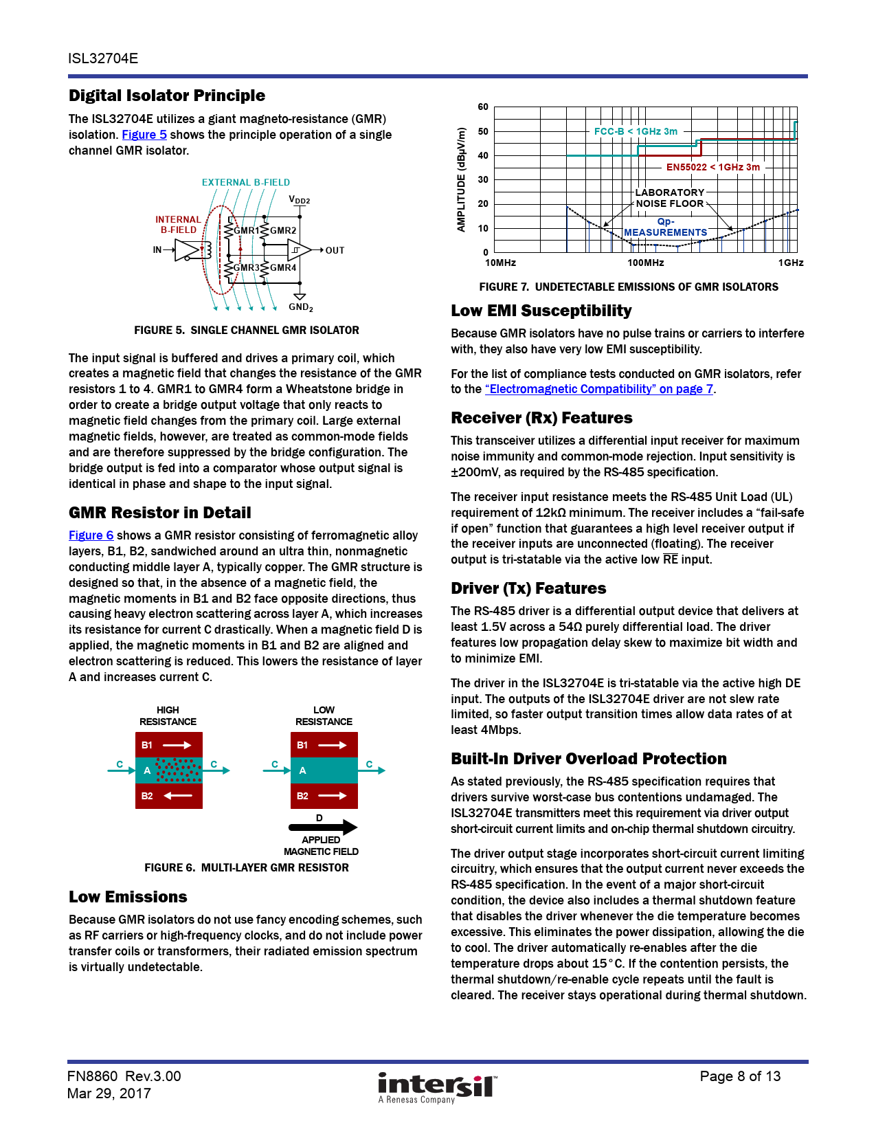 Low EMI Susceptibility FIGURE 5. SINGLE CHANNEL GMR ISOLATOR Because GMR isolators have no pulse trains or carriers to interfere with, they also have very low EMI susceptibility. The input signal is buffered and drives a primary coil, which creates a magnetic field that changes the resistance of the GMR For the list of compliance tests conducted on GMR isolators, refer resistors 1 to 4. GMR1 to GMR4 form a Wheatstone bridge in to the “Electromagnetic Compatibility” on page 7. order to create a bridge output voltage that only reacts to magnetic field changes from the primary coil. Large external Receiver (Rx) Features magnetic fields, however, are treated as common-mode fields This transceiver utilizes a differential input receiver for maximum and are therefore suppressed by the bridge configuration. The noise immunity and common-mode rejection. Input sensitivity is bridge output is fed into a comparator whose output signal is ±200mV, as required by the RS-485 specification. identical in phase and shape to the input signal. The receiver input resistance meets the RS-485 Unit Load (UL) GMR Resistor in Detail requirement of 12kΩ minimum. The receiver includes a “fail-safe Figure 6 shows a GMR resistor consisting of ferromagnetic alloy if open” function that guarantees a high level receiver output if layers, B1, B2, sandwiched around an ultra thin, nonmagnetic the receiver inputs are unconnected (floating). The receiver conducting middle layer A, typically copper. The GMR structure is output is tri-statable via the active low RE input. designed so that, in the absence of a magnetic field, the Driver (Tx) Features magnetic moments in B1 and B2 face opposite directions, thus causing heavy electron scattering across layer A, which increases The RS-485 driver is a differential output device that delivers at its resistance for current C drastically. When a magnetic field D is least 1.5V across a 54Ω purely differential load. The driver applied, the magnetic moments in B1 and B2 are aligned and features low propagation delay skew to maximize bit width and electron scattering is reduced. This lowers the resistance of layer to minimize EMI. A and increases current C. The driver in the ISL32704E is tri-statable via the active high DE input. The outputs of the ISL32704E driver are not slew rate