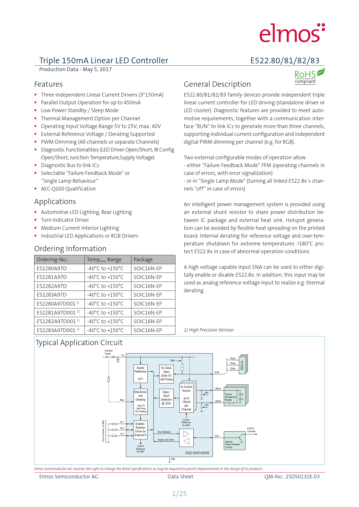Triple 150mA Linear LED Controller E522.80/81/82/83 Production Data - May 5, 2017 Features General Description Three independent Linear Current Drivers (3*150mA) E522.80/81/82/83 family devices provide independent triple Parallel Output Operation for up to 450mA linear current controller for LED driving (standalone driver or Low Power Standby / Sleep Mode LED cluster). Diagnostic features are provided to meet auto- Thermal Management Option per Channel motive requirements, together with a communication inter- Operating Input Voltage Range 5V to 25V, max. 40V face “RUN” to link ICs to generate more than three channels, External Reference Voltage / Derating Supported supporting individual current configuration and independent PWM Dimming (All channels or separate Channels) digital PWM dimming per channel (e.g. for RGB). Diagnostic Functionalities (LED Driver Open/Short, IR Config Open/Short, Junction Temperature,Supply Voltage) Two external configurable modes of operation allow Diagnostic Bus to link ICs - either “Failure Feedback Mode” FFM (operating channels in Selectable “Failure Feedback Mode” or case of errors, with error signalization) “Single Lamp Behaviour” - or in “Single Lamp Mode” (turning all linked E522.8x´s chan- AEC-Q100 Qualification nels “off” in case of errors) Applications An intelligent power management system is provided using Automotive LED Lighting, Rear Lighting an external shunt resistor to share power distribution be- Turn Indicator Driver tween IC package and external heat sink. Hotspot genera- Medium Current Interior Lighting tion can be avoided by flexible heat spreading on the printed Industrial LED Applications or RGB Drivers board. Internal derating for reference voltage and over-tem- perature shutdown for extreme temperatures >180°C pro- Ordering Information tect E522.8x in case of abnormal operation conditions. Ordering-No.: TempJunc Range Package A high voltage capable input ENA can be used to either digi- E52280A97D -40°C to +150°C SOIC16N-EP tally enable or disable E522.8x. In addition, this input may be E52281A97D -40°C to +150°C SOIC16N-EP used as analog reference voltage input to realize e.g. thermal E52282A97D -40°C to +150°C SOIC16N-EP derating. E52283A97D -40°C to +150°C SOIC16N-EP E52280A97D001 1) -40°C to +150°C SOIC16N-EP E52281A97D001 1) -40°C to +150°C SOIC16N-EP E52282A97D001 1) -40°C to +150°C SOIC16N-EP E52283A97D001 1) -40°C to +150°C SOIC16N-EP 1) High Precision Version Typical Application Circuit Switched Supply VS RUNx ENA RUNy Supply HV DIAG RUNz E522.8x Reference Open RUN Drain I/O OVT with Pullup 3x Current LEDxA ENA Dimm Open / Source OFF and Short Thermal Management ENA Derating Detection up to LEDxB Resistor @ LEDx 150mA - High VS per OFF - High Temp Channel - Ext. Derating Current IR 1 Reference Disable / for LEDx IR 2 Resistor to BCM / Driver for Error Detection Controller IR 3 External R SLM From Controller / to GND Single Lamp Mode Optional Current Failure Feedback Reference Circuitry for LEDx E522.80/81/82/83 GND Elmos Semiconductor AG reserves the right to change the detail specifications as may be required to permit improvements in the design of its products. Elmos Semiconductor AG Data Sheet QM-No.: 25DS0132E.03 1/25