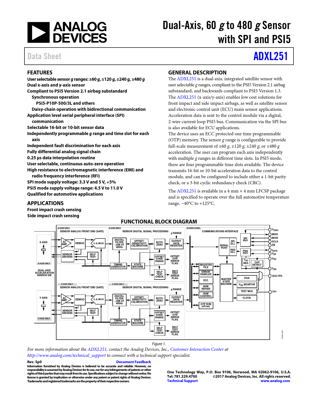 Dual-Axis, 60 g. to 480 g. Sensor. with SPI and PSI5. Data Sheet. ADXL251. FEATURES. GENERAL DESCRIPTION. User selectable sensor g