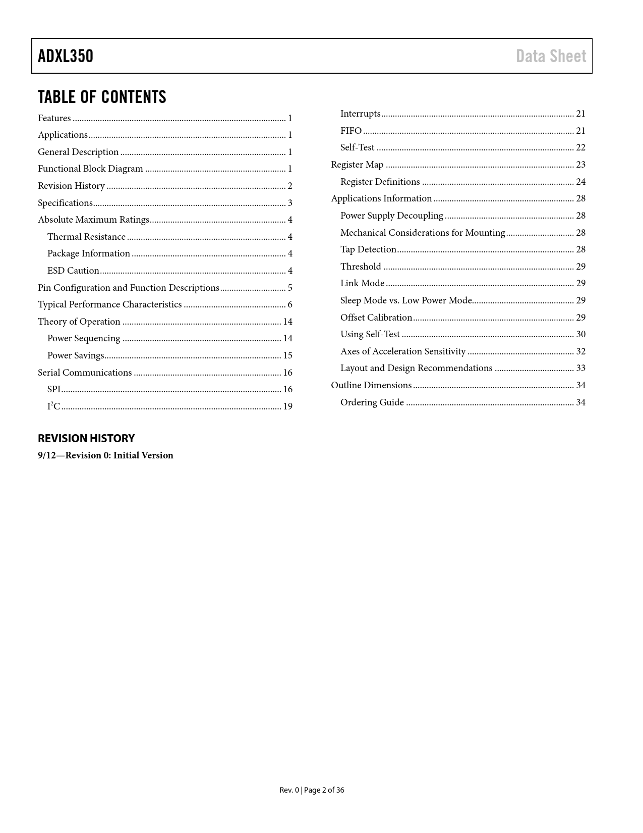 link to page 1 link to page 1 link to page 1 link to page 1 link to page 3 link to page 4 link to page 5 link to page 5 link to page 5 link to page 5 link to page 6 link to page 7 link to page 15 link to page 15 link to page 16 link to page 17 link to page 17 link to page 20 link to page 22 link to page 22 link to page 23 link to page 24 link to page 25 link to page 29 link to page 29 link to page 29 link to page 29 link to page 30 link to page 30 link to page 30 link to page 30 link to page 31 link to page 33 link to page 34 link to page 35 link to page 35 ADXL350Data SheetTABLE OF CONTENTS Features .. 1 Interrupts ... 21 Applications ... 1 FIFO ... 21 General Description ... 1 Self-Test ... 22 Functional Block Diagram .. 1 Register Map ... 23 Revision History ... 2 Register Definitions ... 24 Specifications ... 3 Applications Information .. 28 Absolute Maximum Ratings .. 4 Power Supply Decoupling ... 28 Thermal Resistance .. 4 Mechanical Considerations for Mounting .. 28 Package Information .. 4 Tap Detection .. 28 ESD Caution .. 4 Threshold .. 29 Pin Configuration and Function Descriptions ... 5 Link Mode ... 29 Typical Performance Characteristics ... 6 Sleep Mode vs. Low Power Mode... 29 Theory of Operation .. 14 Offset Calibration ... 29 Power Sequencing .. 14 Using Self-Test .. 30 Power Savings.. 15 Axes of Acceleration Sensitivity ... 32 Serial Communications ... 16 Layout and Design Recommendations ... 33 SPI ... 16 Outline Dimensions ... 34 I2C ... 19 Ordering Guide .. 34 REVISION HISTORY 9/12—Revision 0: Initial Version Rev. 0 | Page 2 of 36 Document Outline Features Applications General Description Functional Block Diagram Revision History Specifications Absolute Maximum Ratings Thermal Resistance Package Information ESD Caution Pin Configuration and Function Descriptions Typical Performance Characteristics Theory of Operation Power Sequencing Power Savings Power Modes Auto Sleep Mode Standby Mode Serial Communications SPI Preventing Bus Traffic Errors I2C Interrupts DATA_READY SINGLE_TAP DOUBLE_TAP Activity Inactivity FREE_FALL Watermark Overrun FIFO Bypass Mode FIFO Mode Stream Mode Trigger Mode Retrieving Data from FIFO Self-Test Register Map Register Definitions Register 0x00—DEVID (Read Only) Register 0x1D—THRESH_TAP (Read/Write) Register 0x1E, Register 0x1F, Register 0x20—OFSX, OFSY, OFSZ (Read/Write) Register 0x21—DUR (Read/Write) Register 0x22—Latent (Read/Write) Register 0x23—Window (Read/Write) Register 0x24—THRESH_ACT (Read/Write) Register 0x25—THRESH_INACT (Read/Write) Register 0x26—TIME_INACT (Read/Write) Register 0x27—ACT_INACT_CTL (Read/Write) ACT AC/DC and INACT AC/DC Bits ACT_x Enable Bits and INACT_x Enable Bits Register 0x28—THRESH_FF (Read/Write) Register 0x29—TIME_FF (Read/Write) Register 0x2A—TAP_AXES (Read/Write) Suppress Bit TAP_x Enable Bits Register 0x2B—ACT_TAP_STATUS (Read Only) ACT_x Source and TAP_x Source Bits Asleep Bit Register 0x2C—BW_RATE (Read/Write) LOW_POWER Bit Rate Bits Register 0x2D—POWER_CTL (Read/Write) Link Bit AUTO_SLEEP Bit Measure Bit Sleep Bit Wakeup Bits Register 0x2E—INT_ENABLE (Read/Write) Register 0x2F—INT_MAP (Read/Write) Register 0x30—INT_SOURCE (Read Only) Register 0x31—DATA_FORMAT (Read/Write) SELF_TEST Bit SPI Bit INT_INVERT Bit FULL_RES Bit Justify Bit Range Bits Register 0x32 to Register 0x37—DATAX0, DATAX1, DATAY0, DATAY1, DATAZ0, DATAZ1 (Read Only) Register 0x38—FIFO_CTL (Read/Write) FIFO_MODE Bits Trigger Bit Samples Bits 0x39—FIFO_STATUS (Read Only) FIFO_TRIG Bit Entries Bits Applications Information Power Supply Decoupling Mechanical Considerations for Mounting Tap Detection Threshold Link Mode Sleep Mode vs. Low Power Mode Offset Calibration Using Self-Test Axes of Acceleration Sensitivity Layout and Design Recommendations Outline Dimensions Ordering Guide