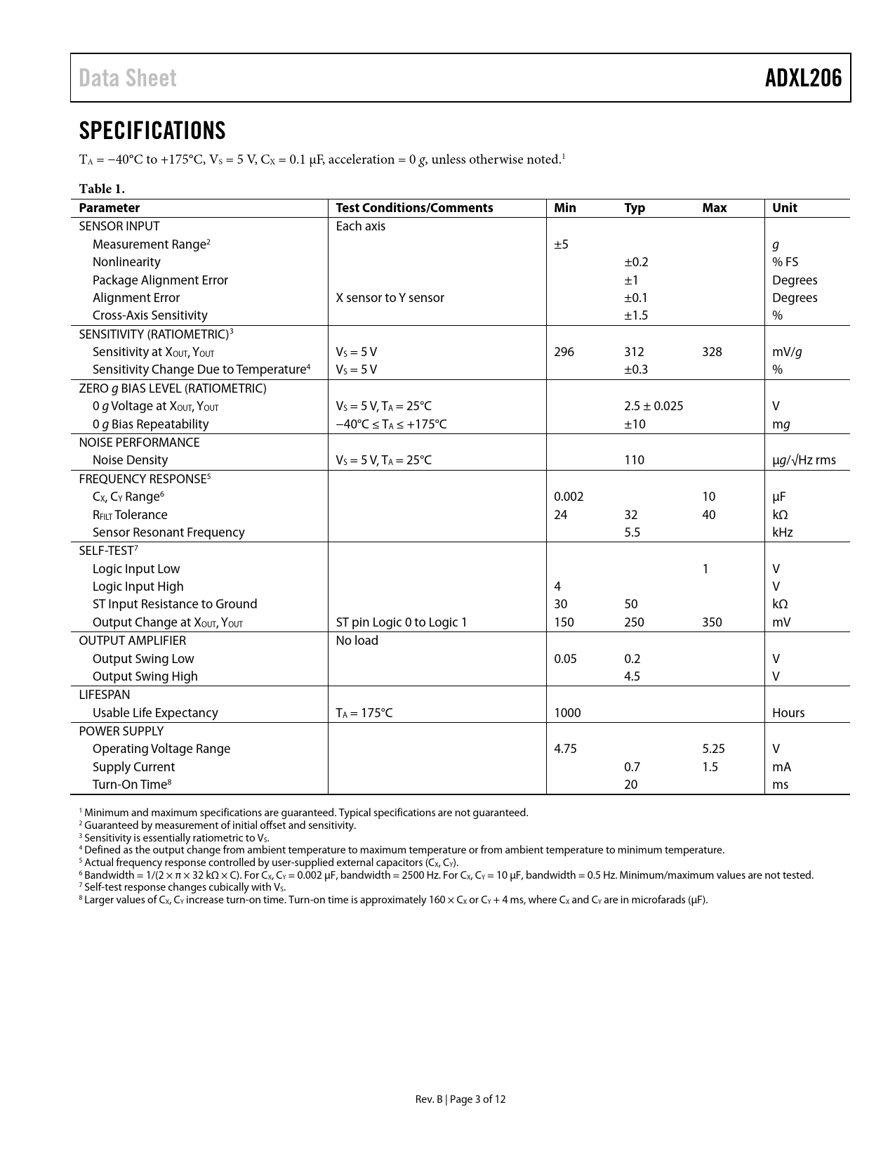 Data Sheet ADXL206 SPECIFICATIONS Table 1 Parameter Test Conditions/Comments Min Typ Max Unit