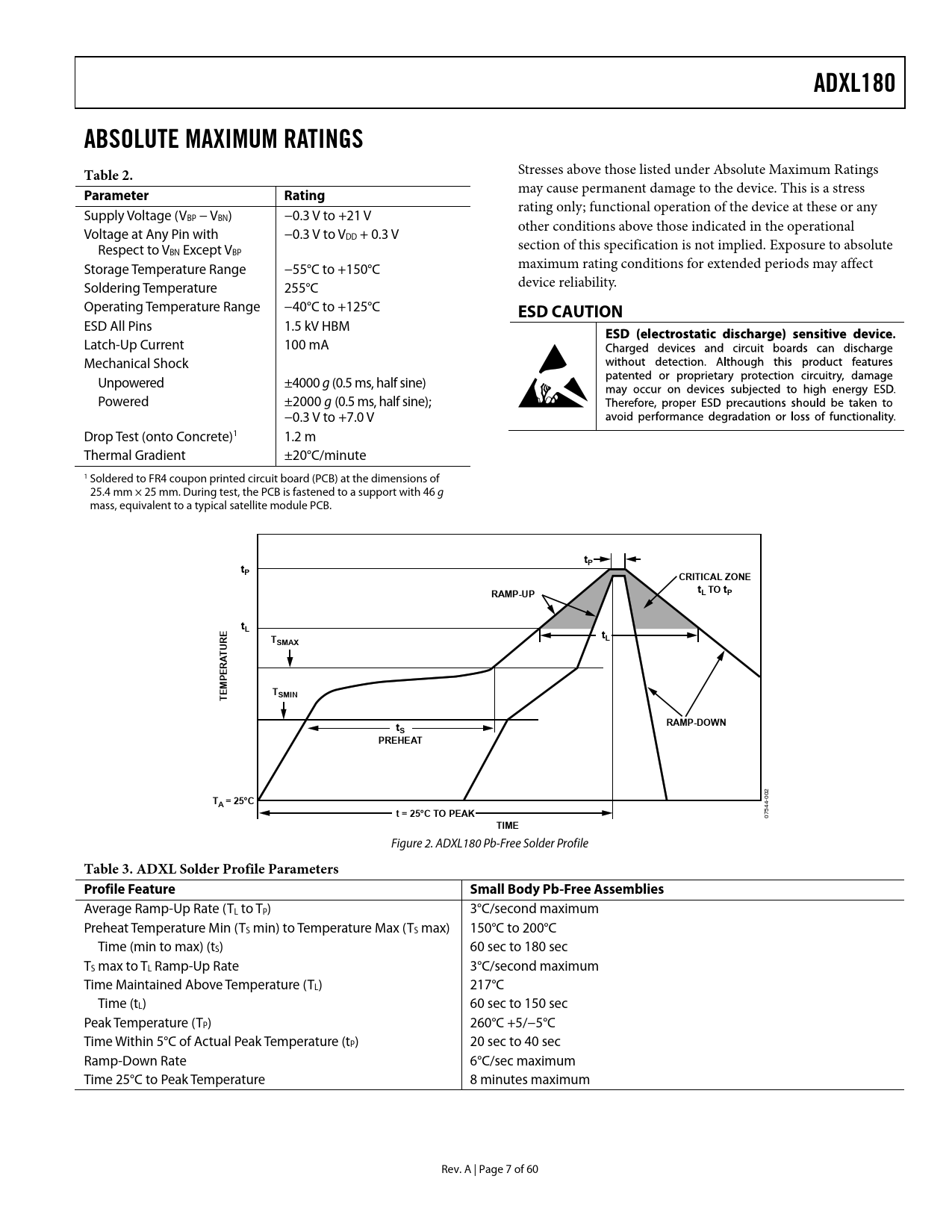 ADXL180ABSOLUTE MAXIMUM RATINGSTable 2. Stresses above those listed under Absolute Maximum Ratings may cause permanent damage to the device. This is a stress Parameter Rating rating only; functional operation of the device at these or any Supply Voltage (VBP − VBN) −0.3 V to +21 V other conditions above those indicated in the operational Voltage at Any Pin with −0.3 V to VDD + 0.3 V Respect to V section of this specification is not implied. Exposure to absolute BN Except VBP Storage Temperature Range −55°C to +150°C maximum rating conditions for extended periods may affect Soldering Temperature 255°C device reliability. Operating Temperature Range −40°C to +125°C ESD CAUTION ESD All Pins 1.5 kV HBM Latch-Up Current 100 mA Mechanical Shock Unpowered ±4000 g (0.5 ms, half sine) Powered ±2000 g (0.5 ms, half sine); −0.3 V to +7.0 V Drop Test (onto Concrete)1 1.2 m Thermal Gradient ±20°C/minute 1 Soldered to FR4 coupon printed circuit board (PCB) at the dimensions of 25.4 mm × 25 mm. During test, the PCB is fastened to a support with 46 g mass, equivalent to a typical satellite module PCB. tPtPCRITICAL ZONERAMP-UPtL TO tPtELtRLTUSMAXT APER EMTTSMINRAMP-DOWNtSPREHEAT 02 T 0 A = 25°C 4- t = 25°C TO PEAK 54 07 TIME Figure 2. ADXL180 Pb-Free Solder Profile Table 3. ADXL Solder Profile Parameters Profile FeatureSmall Body Pb-Free Assemblies Average Ramp-Up Rate (TL to TP) 3°C/second maximum Preheat Temperature Min (TS min) to Temperature Max (TS max) 150°C to 200°C Time (min to max) (tS) 60 sec to 180 sec TS max to TL Ramp-Up Rate 3°C/second maximum Time Maintained Above Temperature (TL) 217°C Time (tL) 60 sec to 150 sec Peak Temperature (TP) 260°C +5/−5°C Time Within 5°C of Actual Peak Temperature (tP) 20 sec to 40 sec Ramp-Down Rate 6°C/sec maximum Time 25°C to Peak Temperature 8 minutes maximum Rev. A | Page 7 of 60 Document Outline FEATURES APPLICATIONS GENERAL DESCRIPTION FUNCTIONAL BLOCK DIAGRAM TABLE OF CONTENTS REVISION HISTORY SPECIFICATIONS ABSOLUTE MAXIMUM RATINGS ESD CAUTION PIN CONFIGURATION AND FUNCTION DESCRIPTIONS TERMINOLOGY THEORY OF OPERATION OVERVIEW ACCELERATION SENSOR SIGNAL PROCESSING DIGITAL COMMUNICATIONS STATE MACHINE 2-WIRE CURRENT MODULATED INTERFACE SYNCHRONOUS OPERATION AND DUAL DEVICE BUS PROGRAMMED MEMORY AND CONFIGURABILITY Factory-Programmed Serial Number and Manufacturer Information User-Programmable Data Register User-Programmed Configuration Physical Layer (ISO Layer 1) Data Link Layer (ISO Layer 2) Application Layer (ISO Layer 7) PHYSICAL INTERFACE APPLICATION CIRCUIT CURRENT MODULATION MANCHESTER DATA ENCODING OPERATION AT LOW VBP OR LOW VDD OPERATION AT HIGH VDD COMMUNICATIONS TIMING AND BUS TOPOLOGIES DATA TRANSMISSION ASYNCHRONOUS COMMUNICATION Asynchronous Single Device Point-to-Point Topology SYNCHRONOUS COMMUNICATION Configuring the ADXL180 for Synchronous Operation Synchronization Pulse Detection Bus Discharge Enable Synchronous Single Device Point-to-Point Topology SYNCHRONOUS COMMUNICATION MODE—DUAL DEVICE Configuring Synchronous Operation Delay Selection Fixed Delay Mode Autodelay Mode Dual Device Synchronous Parallel Topology Dual Device Synchronous Series Topology DATA FRAME DEFINITION DATA FRAME TRANSMISSION FORMAT DATA FRAME CONFIGURATION OPTIONS ACCELERATION DATA CODING STATE VECTOR CODING STATE VECTOR DESCRIPTIONS TRANSMISSION ERROR DETECTION OPTIONS CRC Encoding Parity Encoding APPLICATION LAYER: COMMUNICATION PROTOCOL STATE MACHINE ADXL180 STATE MACHINE PHASE 1: POWER-ON-RESET INITIALIZATION PHASE 2: DEVICE DATA TRANSMISSION Overview Influence of MD on Data Range Device Data Mapping in Phase 2 PHASE 2: MODE DESCRIPTION Mode 0 Asynchronous Mode Synchronous Mode Mode 1 Mode 2 Device Data User Bits and User Register (UREG) 10-Bit Data and Mode 2 Mode 3 Device Data User Register (UREG) Use with State Vector Enabled Illegal Configuration: Mode 3 and 8-Bit Data PHASE 3: SELF-TEST DIAGNOSTIC Concept of Self-Test Internal and External Self-Test Option External Self-Test Internal Self-Test Influence of MD Selections On Transmitted Self-Test Data PHASE 4: AUTO-ZERO INITIALIZATION Fast Auto-Zero Mode Error Reporting PHASE 5: NORMAL OPERATION Slow Auto-Zero Error Reporting SIGNAL RANGE AND FILTERING TRANSFER FUNCTION OVERVIEW RANGE THREE-POLE BESSEL FILTER AUTO-ZERO OPERATION Offset Drift Monitoring ERROR DETECTION OVERVIEW PARITY ERROR DUE TO COMMUNICATIONS PROTOCOL CONFIGURATION BIT ERROR SELF-TEST ERROR OFFSET ERROR/OFFSET DRIFT MONITORING VOLTAGE REGULATOR MONITOR RESET OPERATION TEST AND DIAGNOSTIC TOOLS VSCI SIGNAL CHAIN INPUT TEST PIN VSCO ANALOG SIGNAL CHAIN OUTPUT TEST PIN CONFIGURATION SPECIFICATION OVERVIEW CONFIGURATION MODE TRANSMIT COMMUNICATIONS PROTOCOL CONFIGURATION MODE COMMAND (RECEIVE) COMMUNICATIONS PROTOCOL CONFIGURATION MODE COMMUNICATIONS HANDSHAKING CONFIGURATION AND USER DATA REGISTERS CONFIGURATION MODE EXIT SERIAL NUMBER AND MANUFACTURER IDENTIFICATION DATA REGISTERS PROGRAMMING THE CONFIGURATION AND USER DATA REGISTERS OTP PROGRAMMING CONDITIONS AND CONSIDERATIONS CONFIGURATION/USER REGISTER OTP PARITY CONFIGURATION MODE ERROR REPORTING CONFIGURATION REGISTER REFERENCE UD[7:0] USER DATA BITS UD8 CONFIGURATION BIT BDE SCOE FDLY ADME STI FC[1:0] RG[2:0] MD[1:0] SYEN AZE ERC DAT SVD CUPAR AND CUPRG AXIS OF SENSITIVITY BRANDING OUTLINE DIMENSIONS ORDERING GUIDE