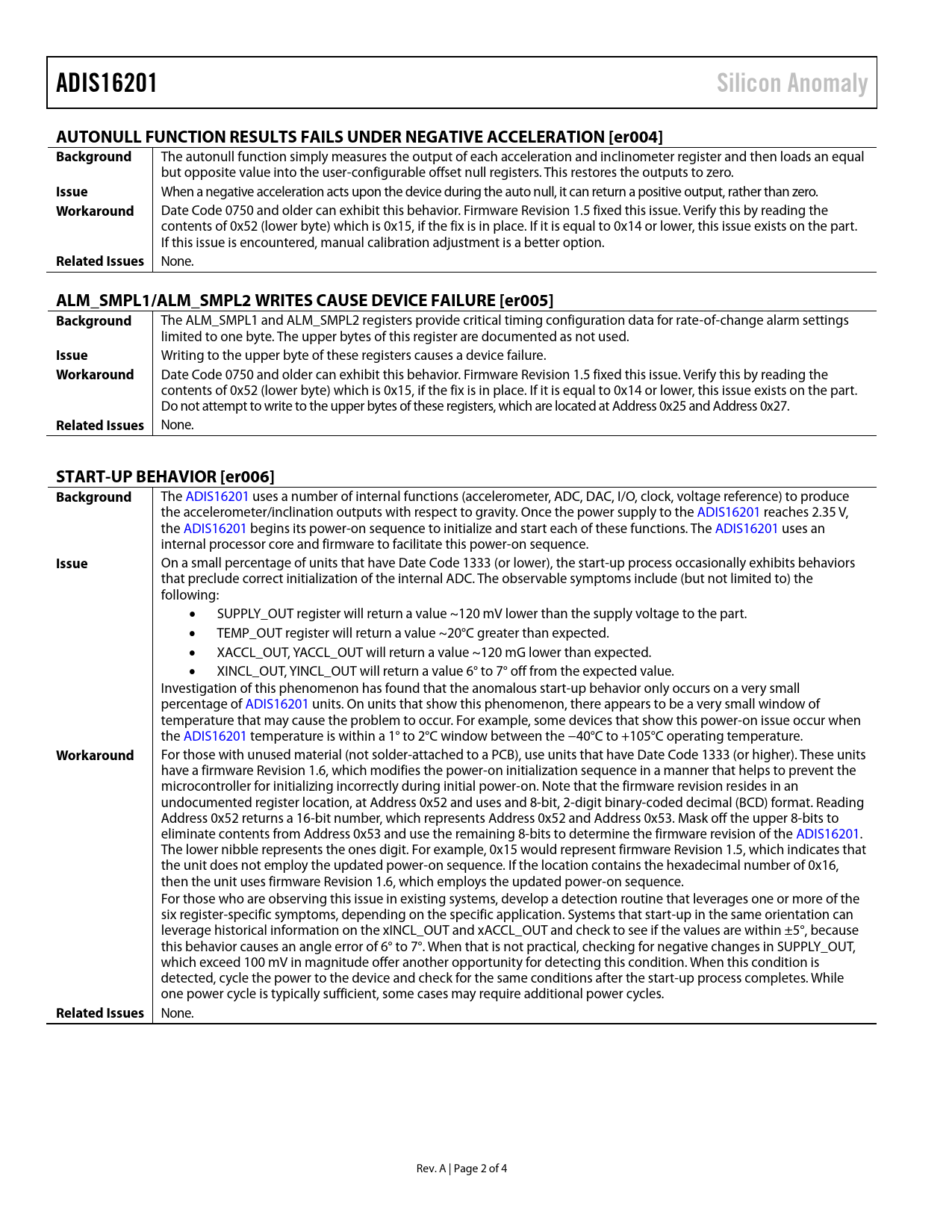 None. Rev. A | Page 2 of 4 Document Outline ADIS16201 Anomalies ADIS16201 Functionality Issues Manual Flash Memory Update Failures [er001] Scale Calibration Register Math Error [er002] STATUS Register Not Clearing When Read [er003] Autonull Function Results Fails Under Negative Acceleration [er004] ALM_SMPL1/ALM_SMPL2 Writes Cause Device Failure [er005] Start-Up Behavior [er006] Functionality Issues