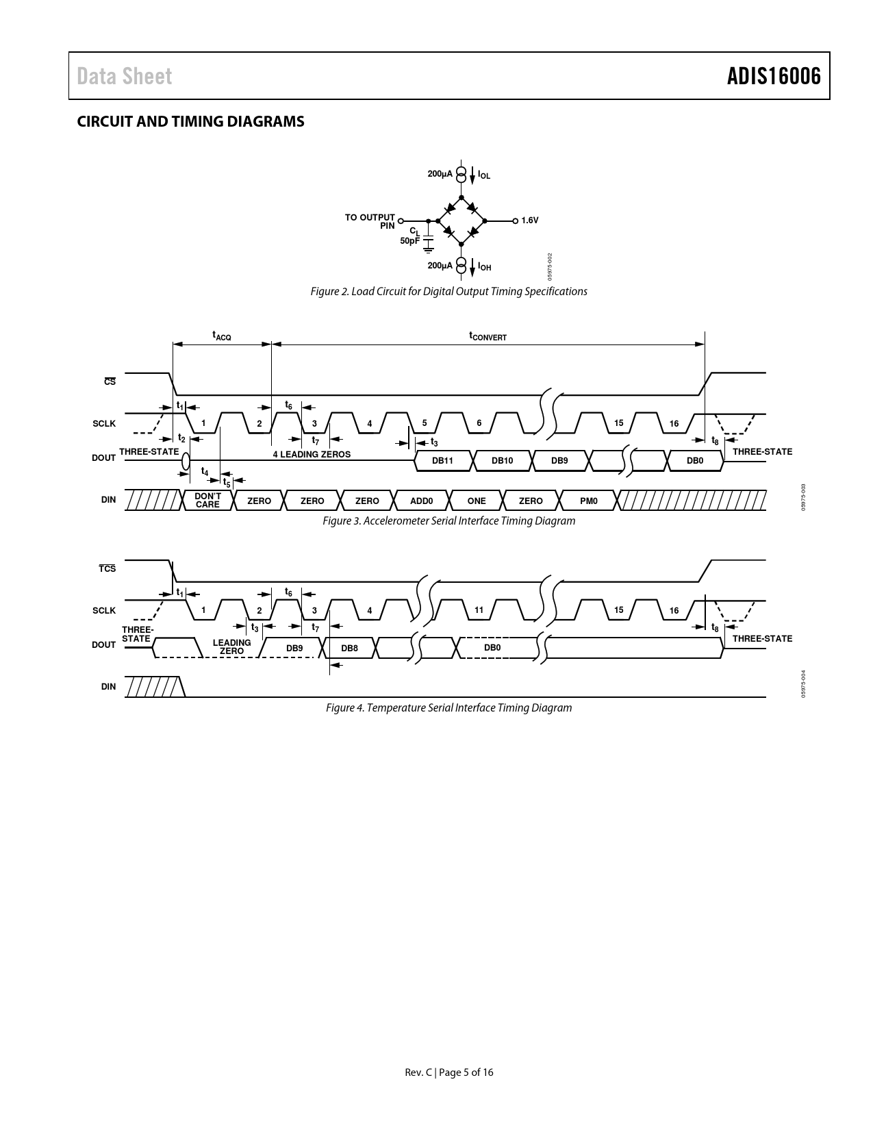 Data SheetADIS16006CIRCUIT AND TIMING DIAGRAMS200µAIOLTO OUTPUT1.6VPINCL50pF 2 00 200µAIOH 5- 97 05 Figure 2. Load Circuit for Digital Output Timing Specifications tACQtCONVERTCSt1t6SCLK1234561516t2t7tt38THREE-STATETHREE-STATEDOUT4 LEADING ZEROSDB11DB10DB9DB0t4t5 3 -00 DINDON’T 75 CAREZEROZEROZEROADD0ONEZEROPM0 59 0 Figure 3. Accelerometer Serial Interface Timing Diagram TCSt1t6SCLK1234111516THREE-tt37t8STATETHREE-STATEDOUTLEADINGDB9DB8DB0ZERO 4 -00 DIN 75 59 0 Figure 4. Temperature Serial Interface Timing Diagram Rev. C | Page 5 of 16 Document Outline Features Applications General Description Functional Block Diagram Revision History Specifications Timing Specifications Circuit and Timing Diagrams Absolute Maximum Ratings ESD Caution Pin Configuration and Function Descriptions Typical Performance Characteristics Theory of Operation Accelerometer Data Format Self-Test Serial Interface Accelerometer Serial Interface Accelerometer Control Register Power-Down ADD0 ZERO ONE DONTC Accelerometer Conversion Details Temperature Sensor Serial Interface Read Operation Write Operation Temperature Sensor Control Register ZERO Output Data Format Temperature Sensor Conversion Details Power Supply Decoupling Setting the Bandwidth Selecting Filter Characteristics: The Noise/Bandwidth Trade-Off Applications Second Level Assembly Outline Dimensions Ordering Guide