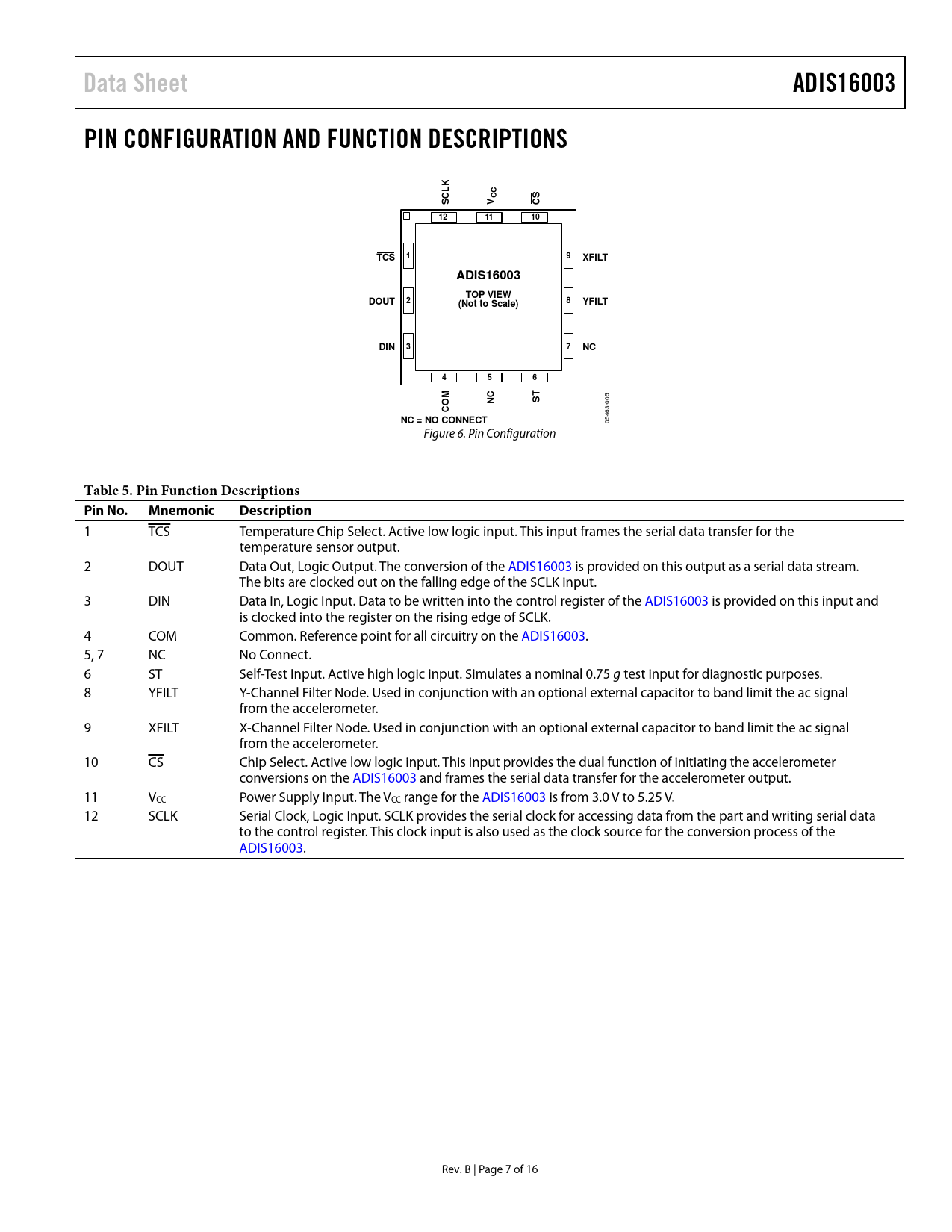 Data Sheet ADIS16003 PIN CONFIGURATION AND FUNCTION DESCRIPTIONS K L C C C S S V C 12 11 10 1 9 TCS XFILT ADIS16003 TOP VIEW DOUT 2 (Not to Scale) 8 YFILT DIN 3 7 NC 4 5 6 M C T