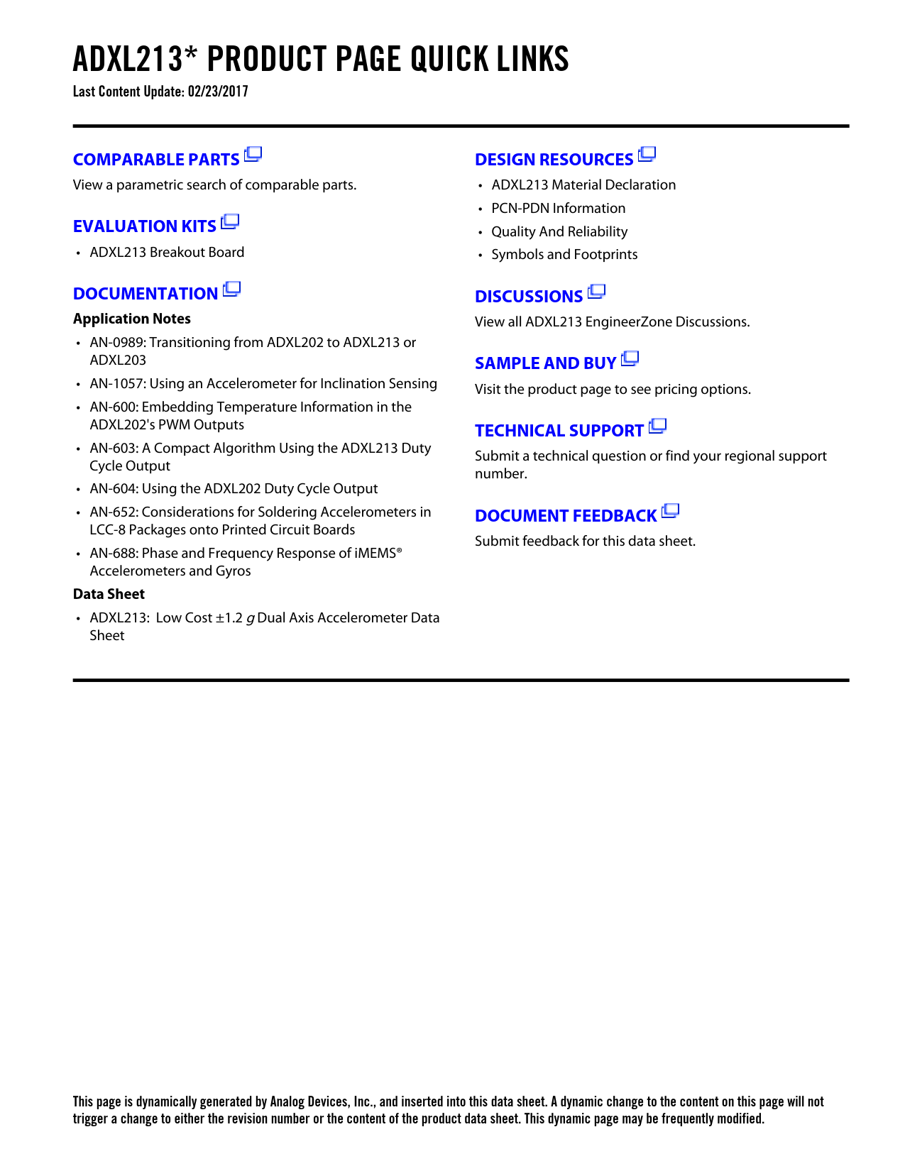 ADXL213* PRODUCT PAGE QUICK LINKS Last Content Update: 02/23/2017 COMPARABLE PARTS DESIGN RESOURCES