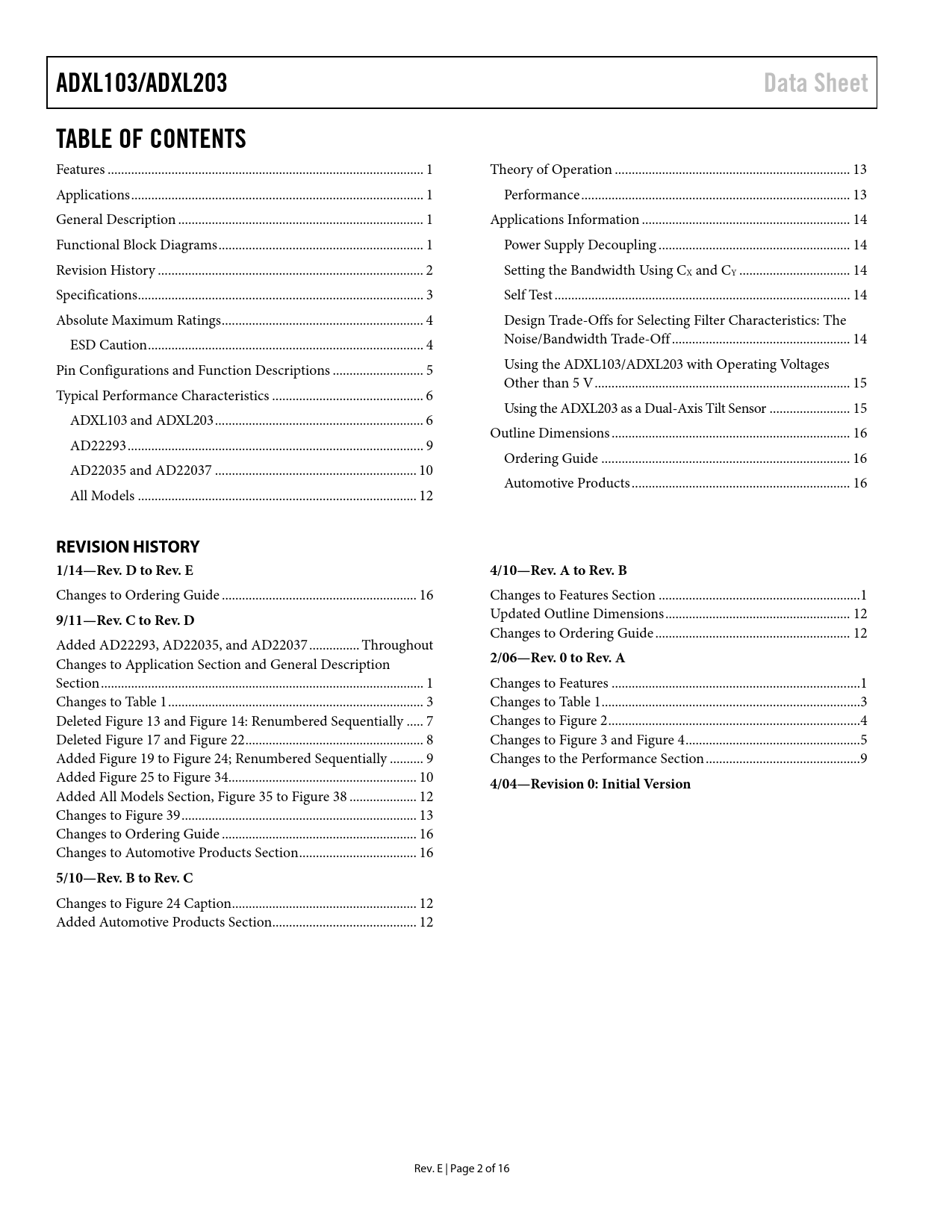 ADXL103/ADXL203 Data Sheet TABLE OF CONTENTS REVISION HISTORY 1/14—Rev D to Rev E 4/10—Rev A to Rev B