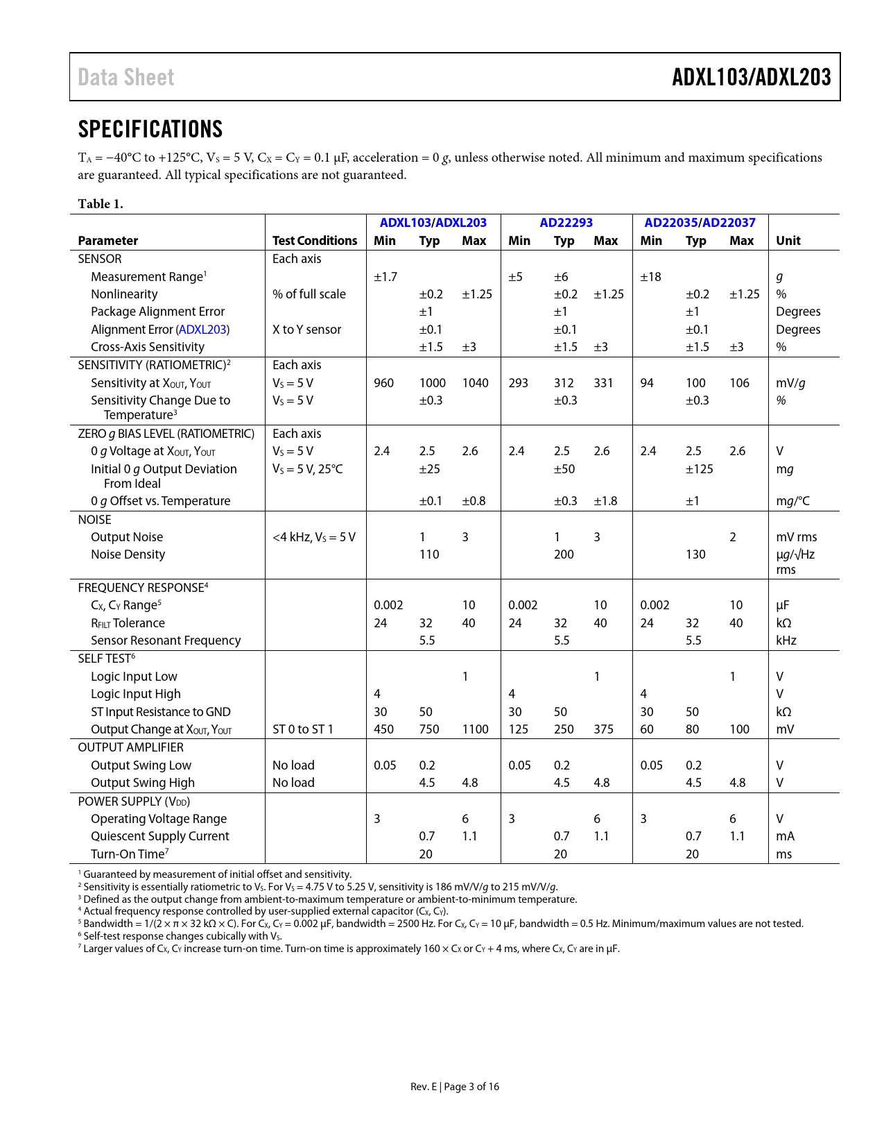 Data Sheet. ADXL103/ADXL203. SPECIFICATIONS. Table 1. ADXL103/. ADXL203. AD22293. AD22035/. AD22037. Parameter. Test. Conditions