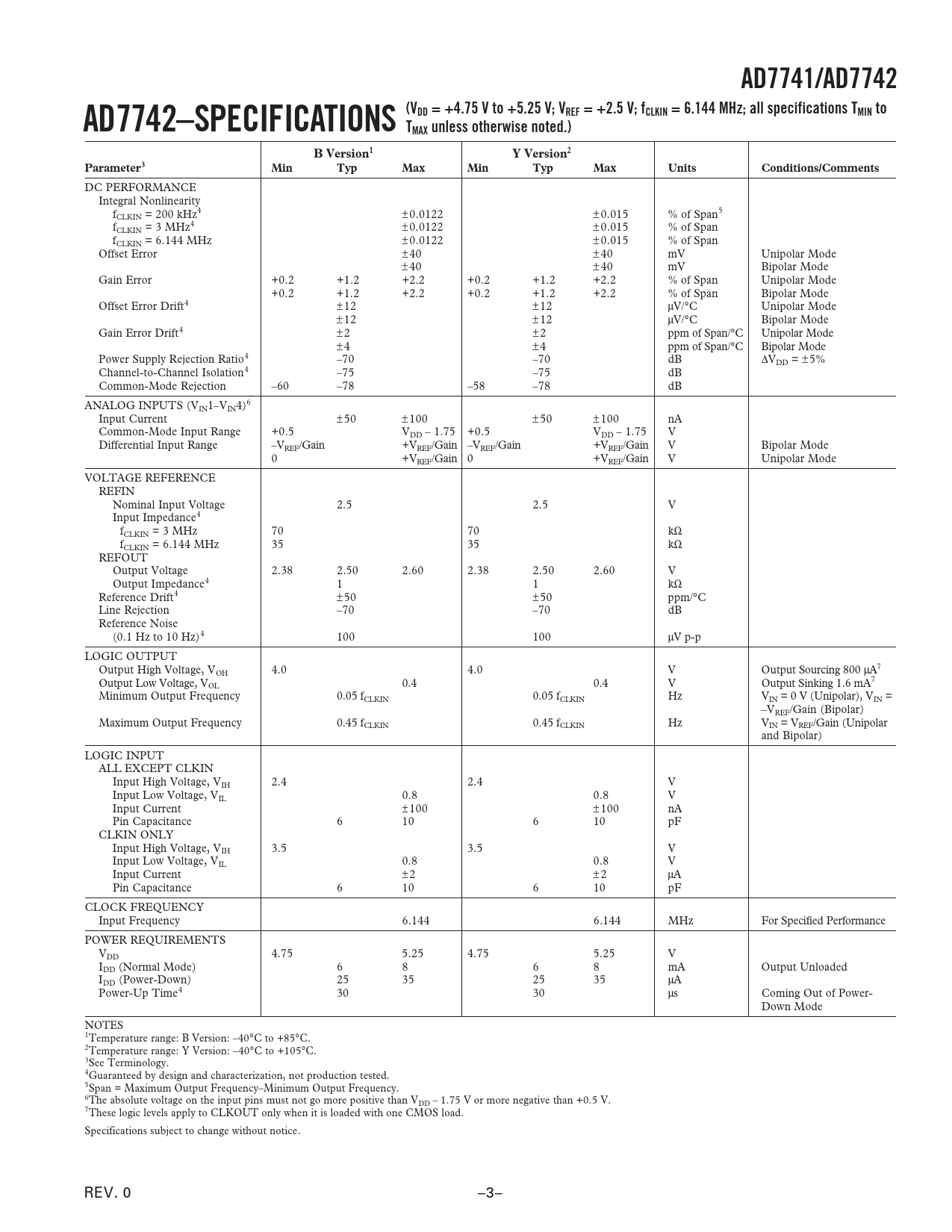 AD7741/AD7742 (VDD = +4.75 V to +5.25 V; VREF = +2.5 V; fCLKIN = 6.144 MHz; all specifications TMIN to AD7742–SPECIFICATIONS TMAX unless otherwise noted.) B Version1 Y Version2 Parameter3 Min Typ Max Min Typ Max Units Conditions/Comments
