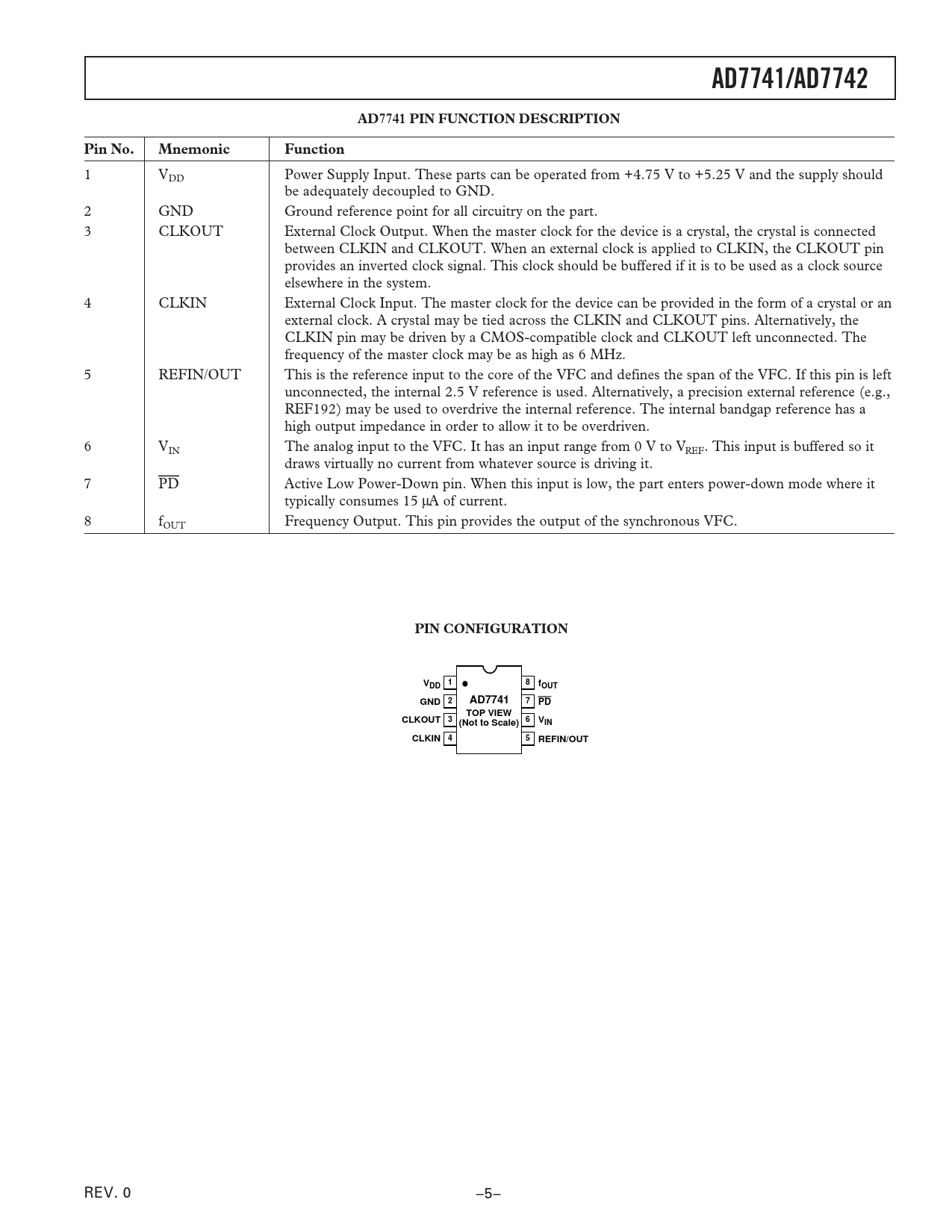 PIN CONFIGURATION 1 8 VDD fOUT GND 2 AD7741 7 PD TOP VIEW CLKOUT 3 (Not to Scale) 6 VIN CLKIN 4 5 REFIN/OUT