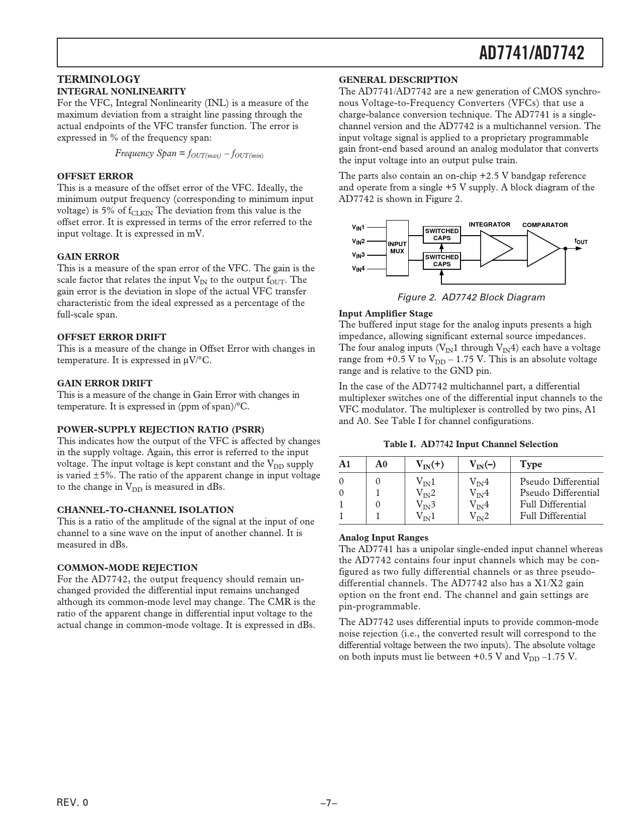 AD7741/AD7742TERMINOLOGYGENERAL DESCRIPTIONINTEGRAL NONLINEARITY The AD7741/AD7742 are a new generation of CMOS synchro- For the VFC, Integral Nonlinearity (INL) is a measure of the nous Voltage-to-Frequency Converters (VFCs) that use a maximum deviation from a straight line passing through the charge-balance conversion technique. The AD7741 is a single- actual endpoints of the VFC transfer function. The error is channel version and the AD7742 is a multichannel version. The expressed in % of the frequency span: input voltage signal is applied to a proprietary programmable Frequency Span = f gain front-end based around an analog modulator that converts OUT(max) – fOUT(min) the input voltage into an output pulse train. OFFSET ERROR The parts also contain an on-chip +2.5 V bandgap reference This is a measure of the offset error of the VFC. Ideally, the and operate from a single +5 V supply. A block diagram of the minimum output frequency (corresponding to minimum input AD7742 is shown in Figure 2. voltage) is 5% of fCLKIN The deviation from this value is the offset error. It is expressed in terms of the error referred to the INTEGRATORCOMPARATORVIN1 input voltage. It is expressed in mV. SWITCHEDCAPSVfIN2OUTINPUTMUXGAIN ERRORVIN3SWITCHED This is a measure of the span error of the VFC. The gain is the CAPSVIN4 scale factor that relates the input VIN to the output fOUT. The gain error is the deviation in slope of the actual VFC transfer Figure 2. AD7742 Block Diagram characteristic from the ideal expressed as a percentage of the full-scale span. Input Amplifier Stage The buffered input stage for the analog inputs presents a high OFFSET ERROR DRIFT impedance, allowing significant external source impedances. This is a measure of the change in Offset Error with changes in The four analog inputs (VIN1 through VIN4) each have a voltage temperature. It is expressed in µV/°C. range from +0.5 V to VDD – 1.75 V. This is an absolute voltage range and is relative to the GND pin. GAIN ERROR DRIFT In the case of the AD7742 multichannel part, a differential This is a measure of the change in Gain Error with changes in multiplexer switches one of the differential input channels to the temperature. It is expressed in (ppm of span)/°C. VFC modulator. The multiplexer is controlled by two pins, A1 and A0. See Table I for channel configurations. POWER-SUPPLY REJECTION RATIO (PSRR) This indicates how the output of the VFC is affected by changes Table I. AD7742 Input Channel Selection in the supply voltage. Again, this error is referred to the input voltage. The input voltage is kept constant and the VDD supply A1A0VIN(+)VIN(–)Type is varied ± 5%. The ratio of the apparent change in input voltage 0 0 V to the change in V IN1 VIN4 Pseudo Differential DD is measured in dBs. 0 1 VIN2 VIN4 Pseudo Differential 1 0 V CHANNEL-TO-CHANNEL ISOLATION IN3 VIN4 Full Differential 1 1 V This is a ratio of the amplitude of the signal at the input of one IN1 VIN2 Full Differential channel to a sine wave on the input of another channel. It is Analog Input Ranges measured in dBs. The AD7741 has a unipolar single-ended input channel whereas the AD7742 contains four input channels which may be con- COMMON-MODE REJECTION figured as two fully differential channels or as three pseudo- For the AD7742, the output frequency should remain un- differential channels. The AD7742 also has a X1/X2 gain changed provided the differential input remains unchanged option on the front end. The channel and gain settings are although its common-mode level may change. The CMR is the pin-programmable. ratio of the apparent change in differential input voltage to the actual change in common-mode voltage. It is expressed in dBs. The AD7742 uses differential inputs to provide common-mode noise rejection (i.e., the converted result will correspond to the differential voltage between the two inputs). The absolute voltage on both inputs must lie between +0.5 V and VDD –1.75 V. REV. 0 –7–